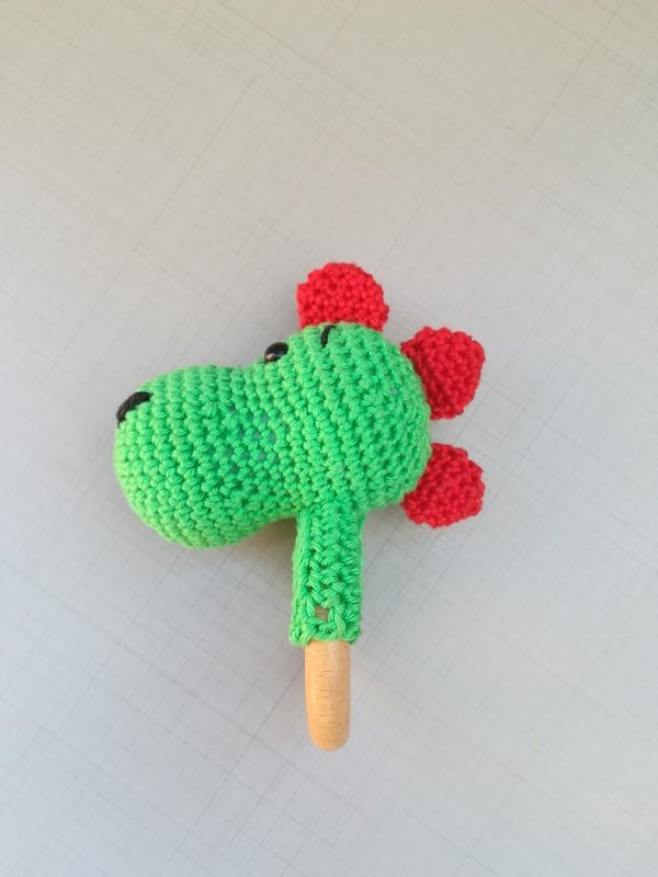Create a memorable handmade gift using our detailed crochet pattern for a charming dinosaur rattle.