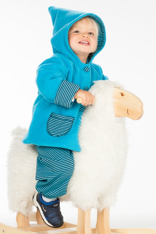 With the TORINO+TORETTO pattern set you can sew a practical baby outfit: a hooded pixie jacket with cuffs and a small pocket, plus comfy pants with elastic at waist and hems. Great for everyday wear and in-between seasons.