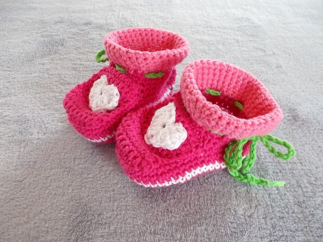 Diese süßen Babyschuhe kannst du mit deinen Wunschfarben häkeln. Die hier gezeigten wurden passend zum gestrickten Babykleidchen mit Lochmuster entworfen.