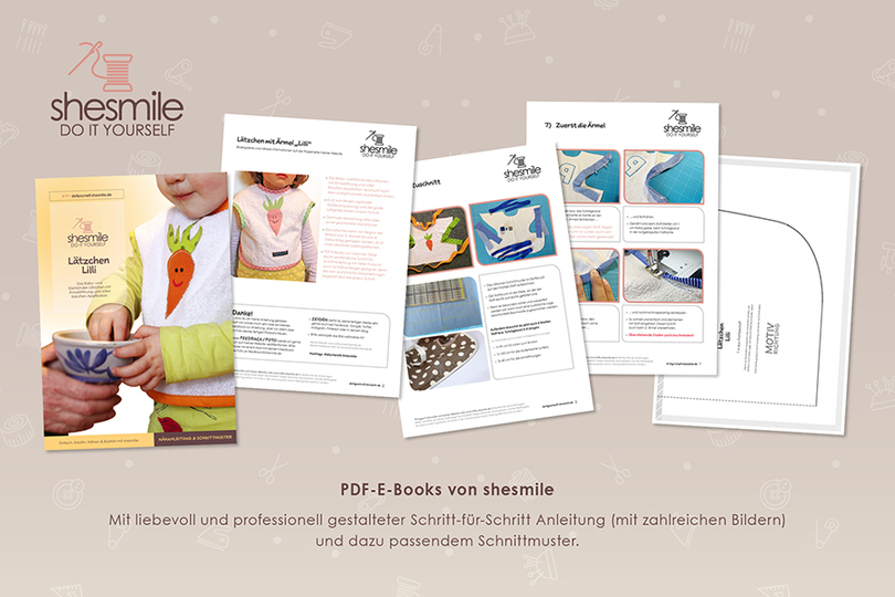 PDF-E-Books von shesmile: Diese leicht verständliche Schritt-für-Schritt-Anleitung mit vielen Fotos ist auch für Nähanfänger geeignet, denn die sehr ausführliche Fotoanleitungen begleitet dich bei jedem Schritt.