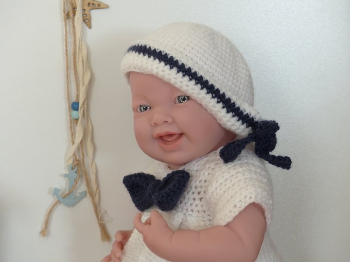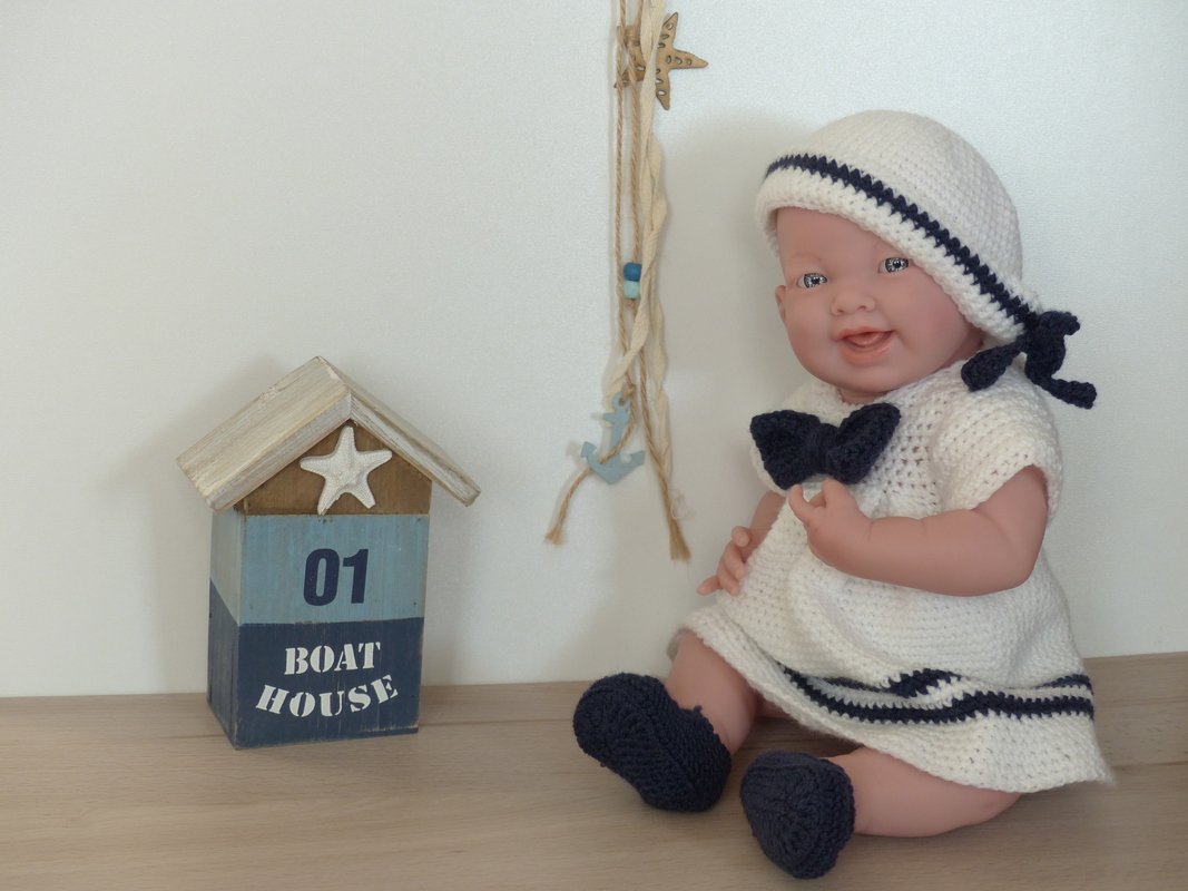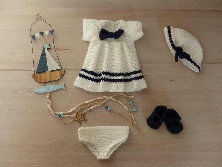 The warm summer invites you to go sailing. Of course you also need a suitable outfit for it. Ideal is this 4-piece set consisting of dress, hat, shoes and panties.