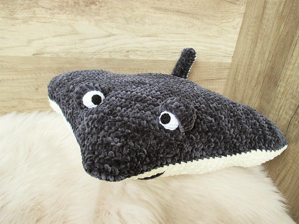 41 cm von Mund- zur Schwanzspitze und 41 cm von Flosse zu Flosse. Und das 1. Knäuel ist noch nicht mal alle, obwohl ich noch 5 Reihen mehr gemacht habe statt 35 sind es 40.