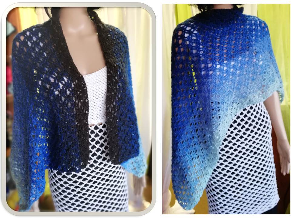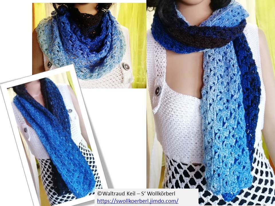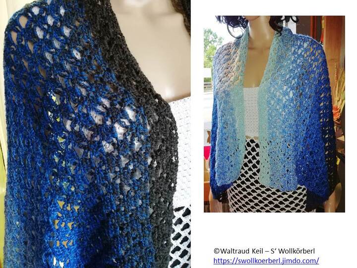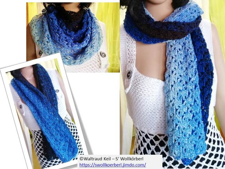 Dieses Tuch ist aus nur 1 Bobbel / Farbverlaufsgarn, 200 g – 800 m (bei mir haben 700 m gereicht), mit Häkelnadel 4,5 gehäkelt oder Wunschgarn, auch 4-fach-Sockengarn ist gut. Es ist vielseitig tragbar – s. Bildergalerie - zu jeder Jahreszeit und jedem Anlass.