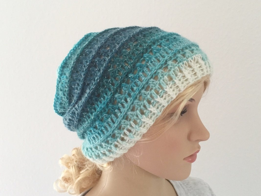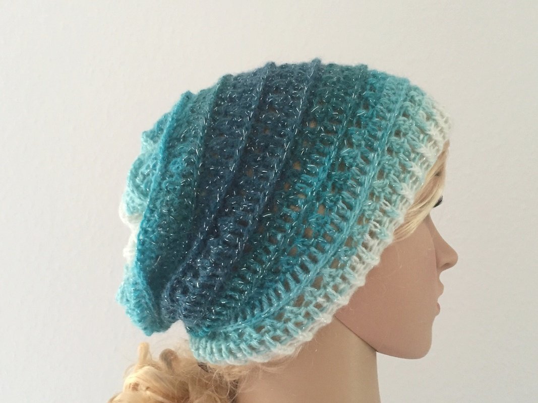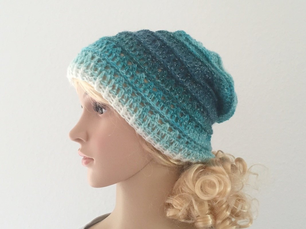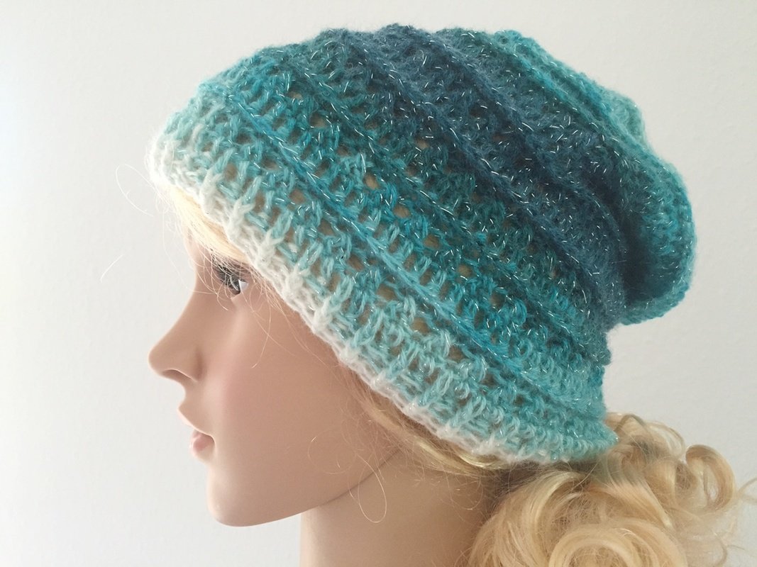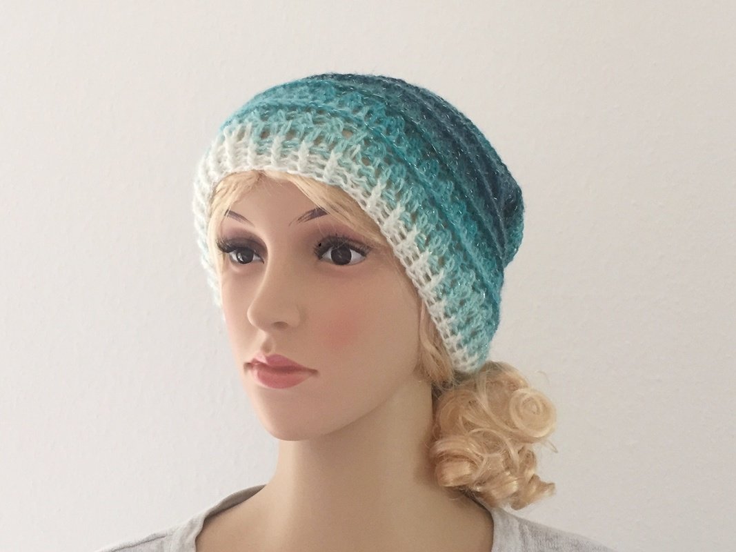 Die Häkelmütze "Eiskönigin" hat ihren Namen aufgrund ihrer Farben erhalten, sieht aber durch den Mustermix auch in anderen Farben und aus anderen Garnen und Wollen einfach toll aus.
