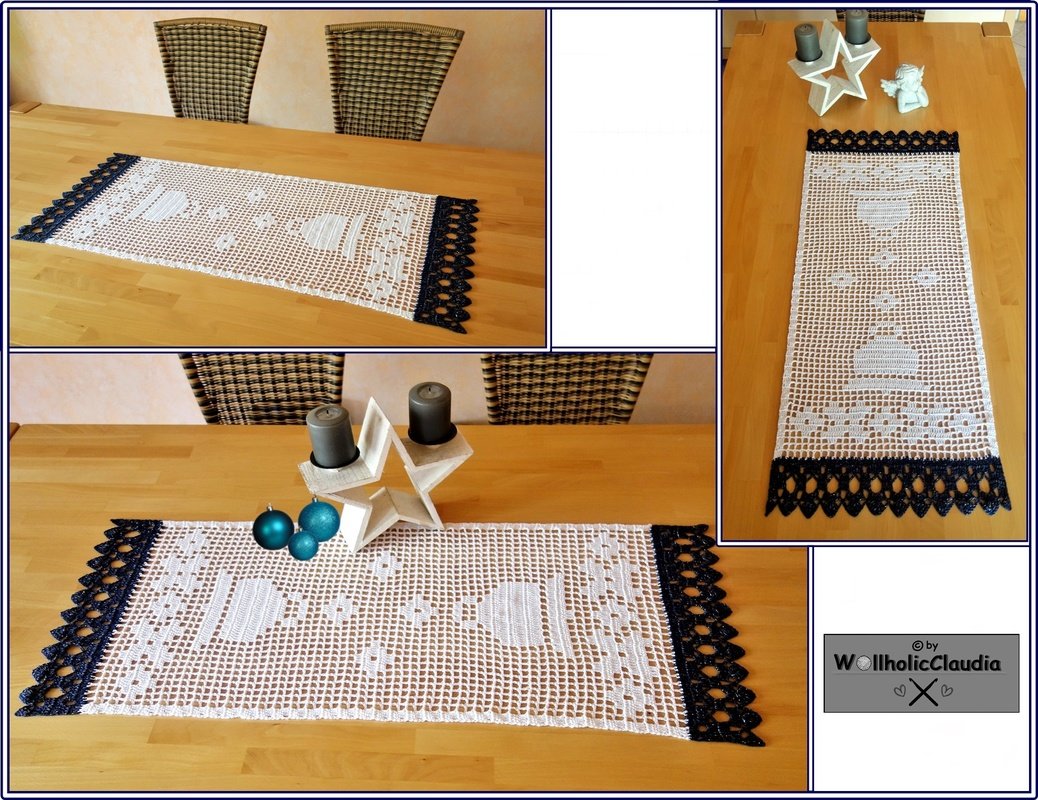 Dieser wunderschöne weihnachtliche Tischläufer mit Glöckchenmotiv schmückt den Esstisch oder jedes Sideboard. Die Anleitung für eine passende Mitteldecke oder das komplette Set ist ebenfalls in meinem Shop erhältlich