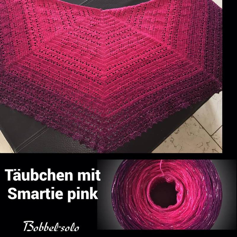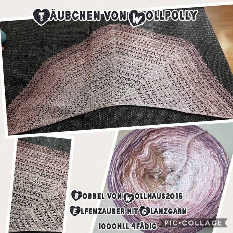 Beim Täubchen handelt es sich um ein Fünfecktuch. Es eignet sich für Anfänger - es werden lediglich Luftmaschen, feste Maschen und Stäbchen benötigt. Bei 1000m Lauflänge erreicht es ungefähr eine Länge von 160cm ist dabei aber nur 60cm tief etwa. Ich wünsche euch viel Spass dabei!