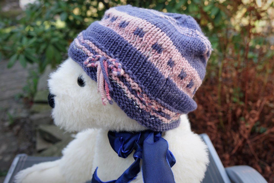 Das Muster ist ein leichtes Hebemaschenmuster und Streifen der 2 Farben und noch ein kleines Schachbrettmuster. Eine Testerin hat auch das Hebemaschenmuster weggelassen und nur Streifen gestrickt.