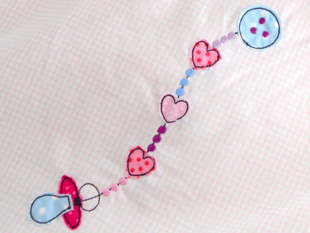 Durch Unterlegen von Sternen/Herzen/Schnuller während des Stickvorganges erhaltet ihr eine süße Schnullerkette in Doodle-Optik (Fransen-Look), einfach überstehenden Stoff während des Stickvorganges abschneiden.