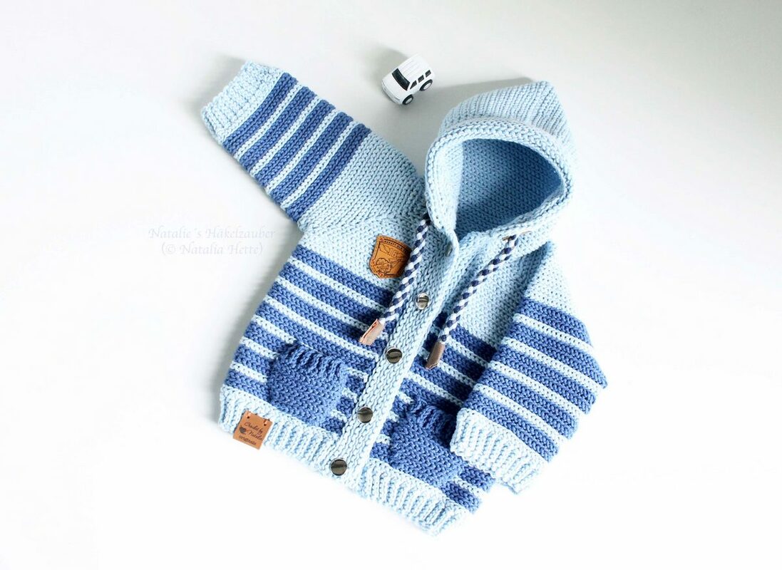 Zwei PDF-Häkelanleitungen bestehend aus bebilderten Anleitungen zum Häkeln von Baby- und Kinderjacke "Maxim", Gr. 56-128, und Babyoverall "Maxim", Gr. 50-104.