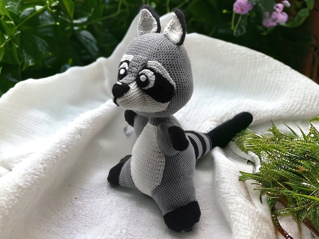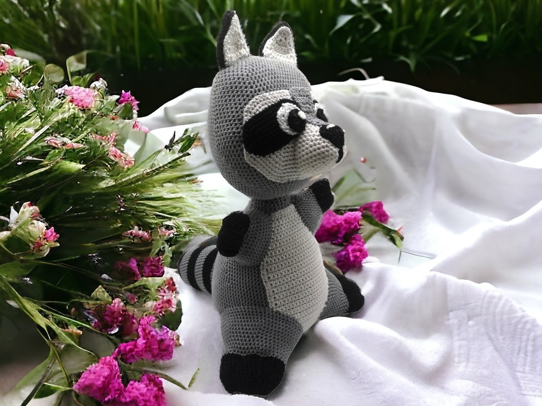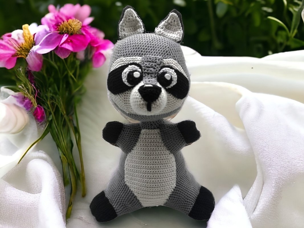 The finished racoon will be about 33cm. Of course, the size can vary depending on whether you crochet tight or loose. The choice of wool is also important. I crochet with cotton yarn 4ply 125m/50g (100% cotton).
