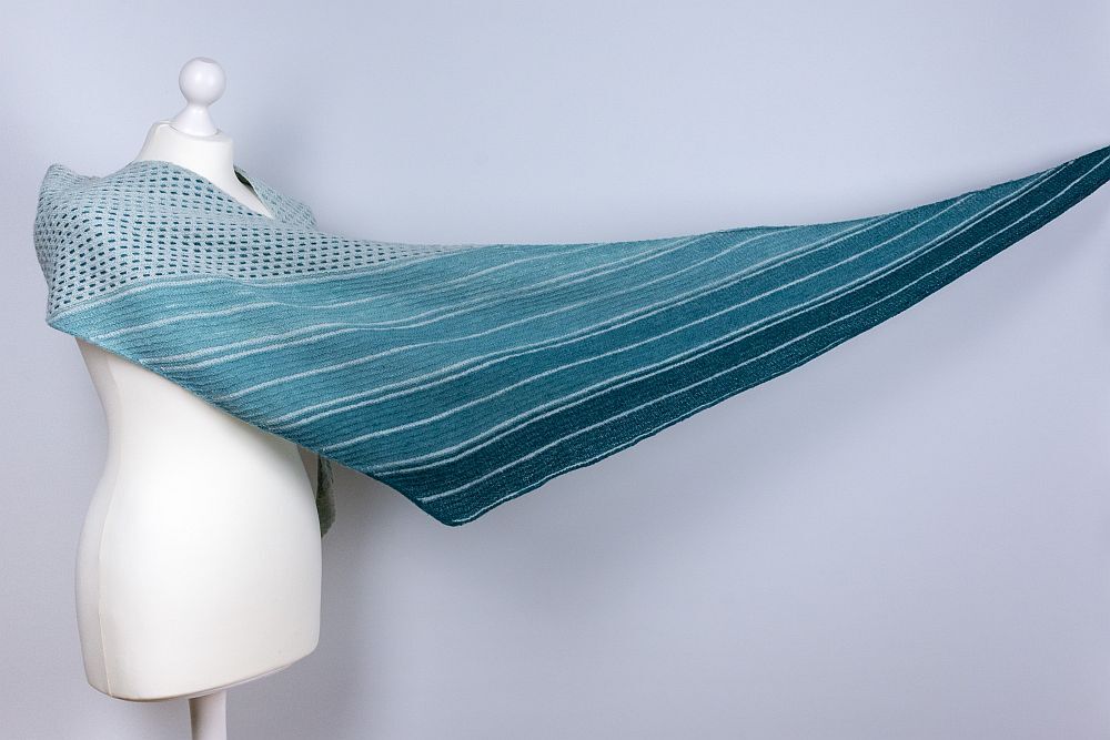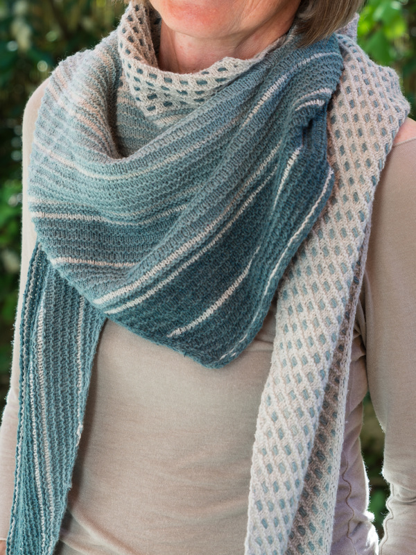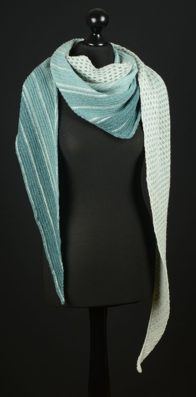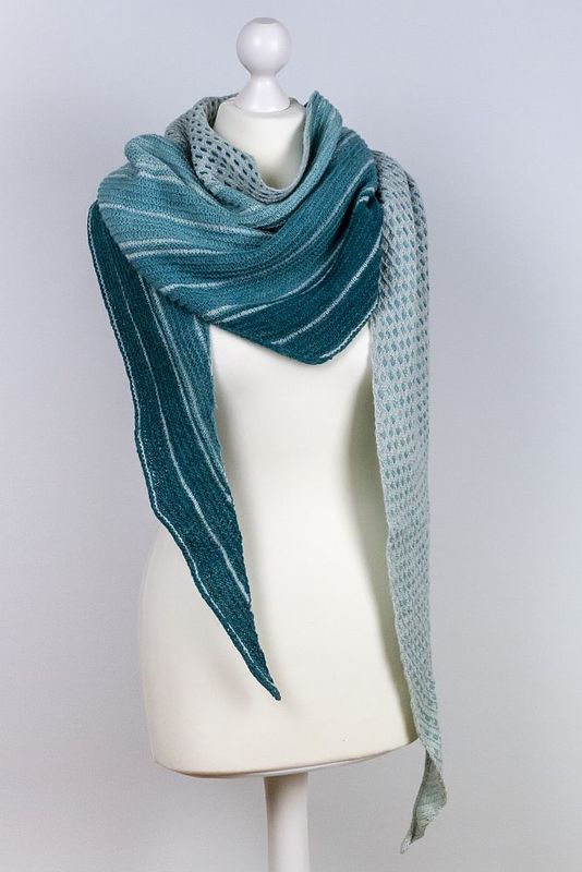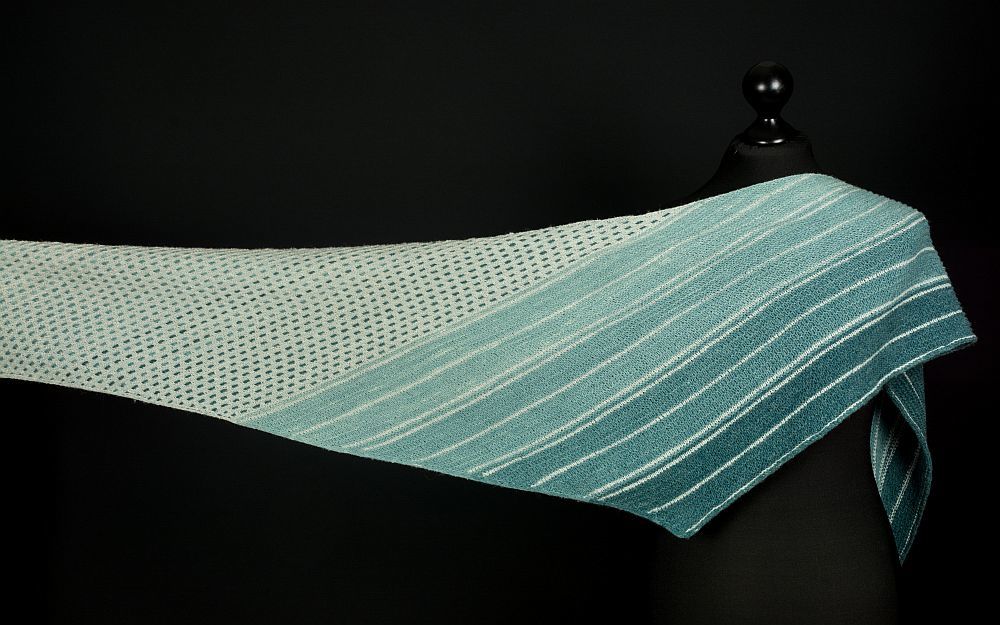 Nord & Nordwest is an asymmetrical triangular shawl that makes a multi skein gradient shine. The colored spots fit effectively into the continuous ribbed structure of the shawl.