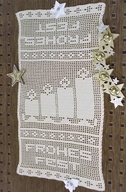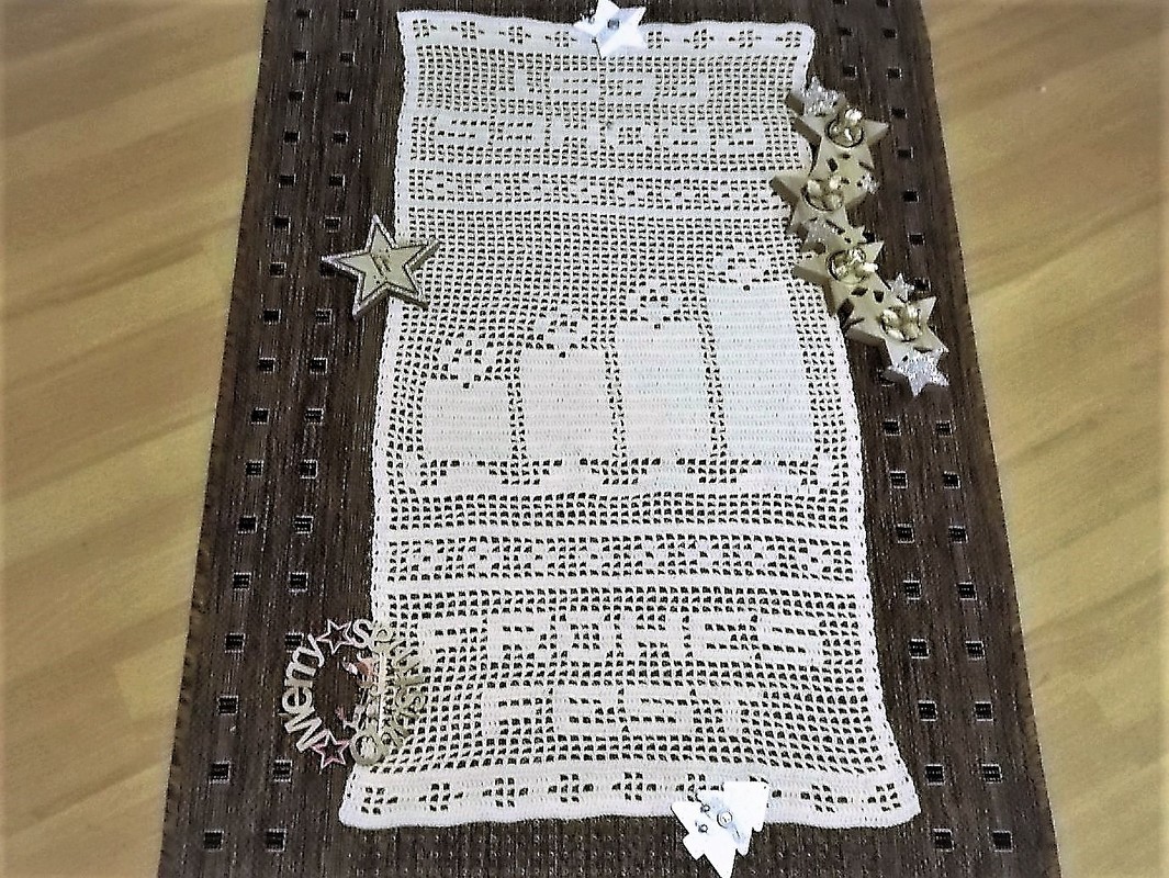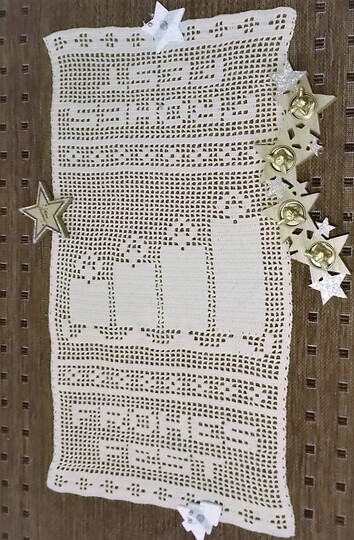 Ein weihnachtlicher Tischläufer mit dem Schriftzug "Frohes Fest" und vier Adventkerzen