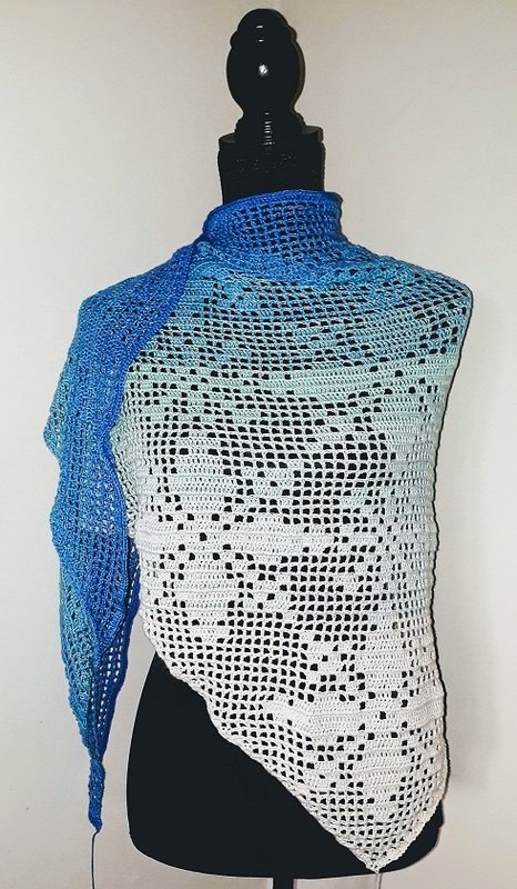 The shawl is made using the filet crochet method