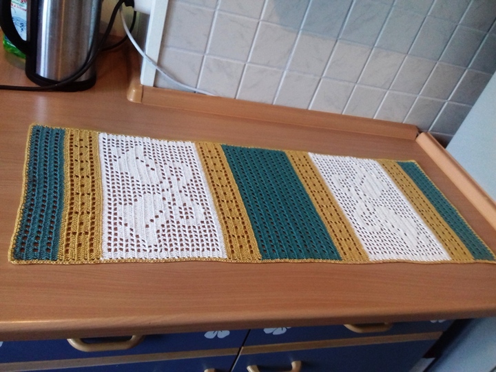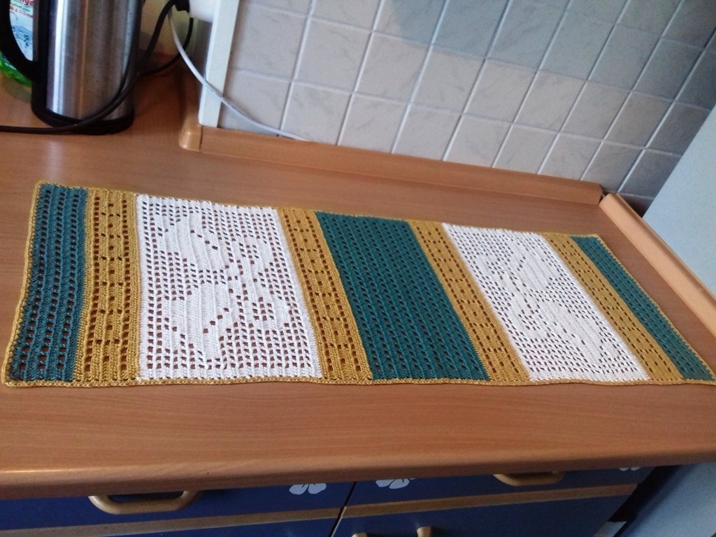 Bei mir ist der Tischläufer ca. 36 cm breit und 99 cm lang. Je Farbe werden 2 Knäuel benötigt. Die Länge ist variabel, einfach in der Mitte Reihen ergänzen oder weglassen. Dann verändert sich aber der Wolleverbrauch. :-)