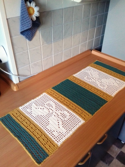 Der Tischläufer wurde mit einer Häkelnadel 2,5 und der Wolle Drops love you 9 in Senf, Grün und Natur gearbeitet. LL 125m / 50g. Wer fest häkelt, nimmt eine Nadelstärke größer.