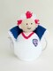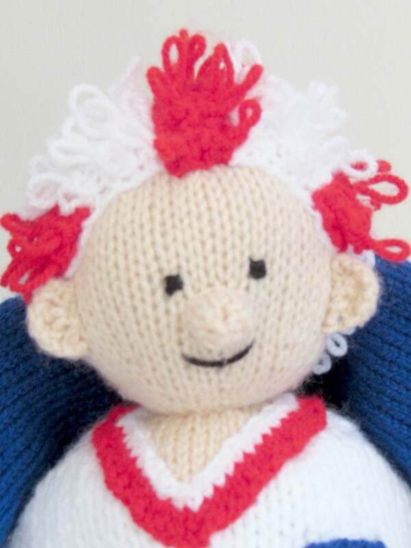 I love the red and white wig. Its knitted with a loopy stitch and just looks fabulous on his head, making him really look the part.