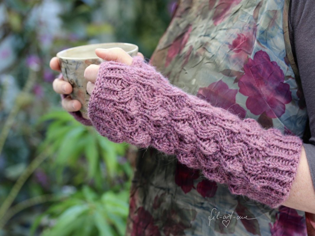 What do you need when it's storming and snowing outside? A chic set consisting of cowl, beanie and fingerless gloves that is cozy warm, has an effective pattern and is uncomplicated to knit!