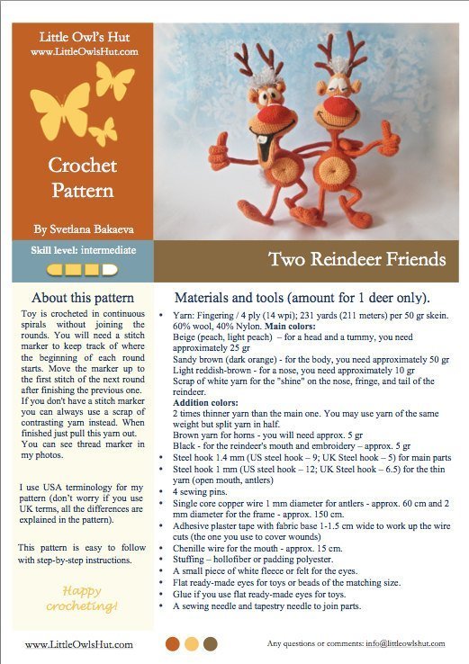 FINISHED SIZE: Approx. 20 cm (8 inches) high (not including antlers) using the materials stated in the pattern.