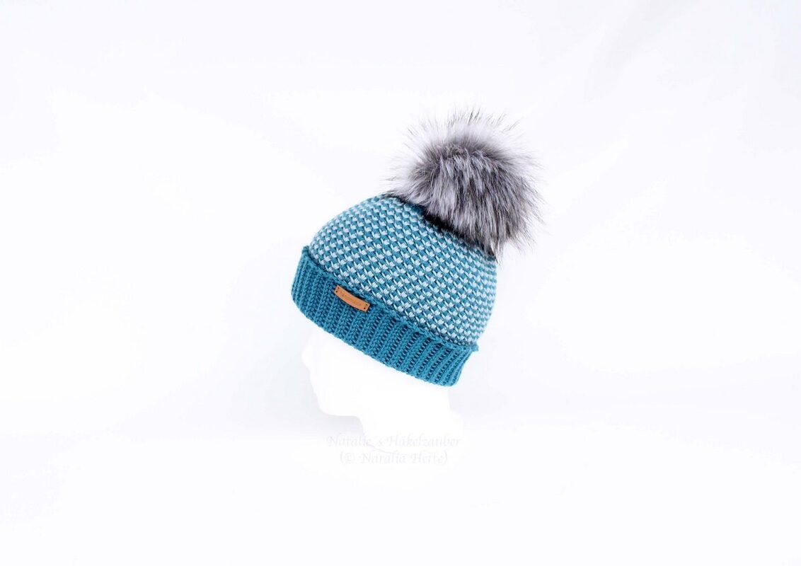 For Beanie: Merino Extrafine from Drops, composition: 100% pure wool, run length approx. 105 m / 50 g, 100 g (+ 50 g more for the beanie with the lapel) of the color petrol (color no. 28) and 50 g of the color light green (color no. 15). Crochet hook No. 4 (EU-size) (for cuffs and upper part) and No. 4.5 (EU-size) (for middle). Fur pom-pom or pom-pom set from Prym and 50 gr. Wool of your choice. Tools: pin, thick needle.
