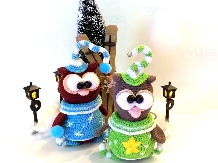 I work mainly with cotton yarn such as Schachenmayer Catania, Carina, Katia Capri or Twister and with a NS of 2.0. Under these conditions Owl is about 12 cm tall (without cap). You can also use any other cotton yarn with a length of 125m at 50 gr or even your favorite wool. The size of the figure can then change.