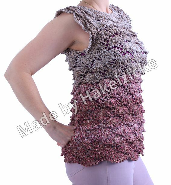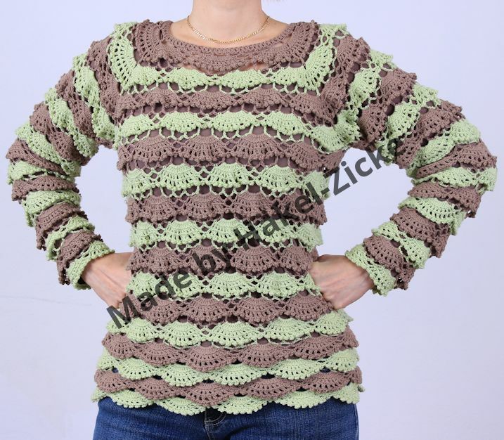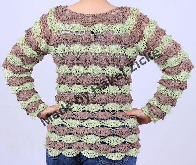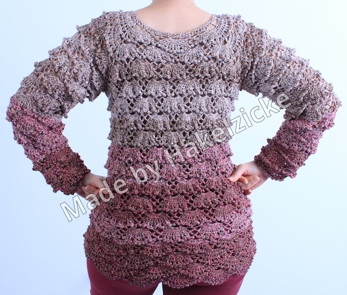 Dieser wunderschöne Fächerbogen-Pullover in Nougat-Mint wurde aus Baumwollgarn in LL ca. 340m per 100g mit Nadelstärke 3 gehäkelt. Er eignet sich hervorragend für alle Jahreszeiten: solo für den Sommer und mit einer Bluse oder einem Shirt für den Rest des Jahres. Prima auch mit kurzen Ärmeln. Und das alles OHNE Nähen , denn mir ist es wichtig, daß meine Modelle ohne drückende oder unschöne Nähte auskommen. Darum wird hier Top-to-Bottom in Runden gehäkelt.