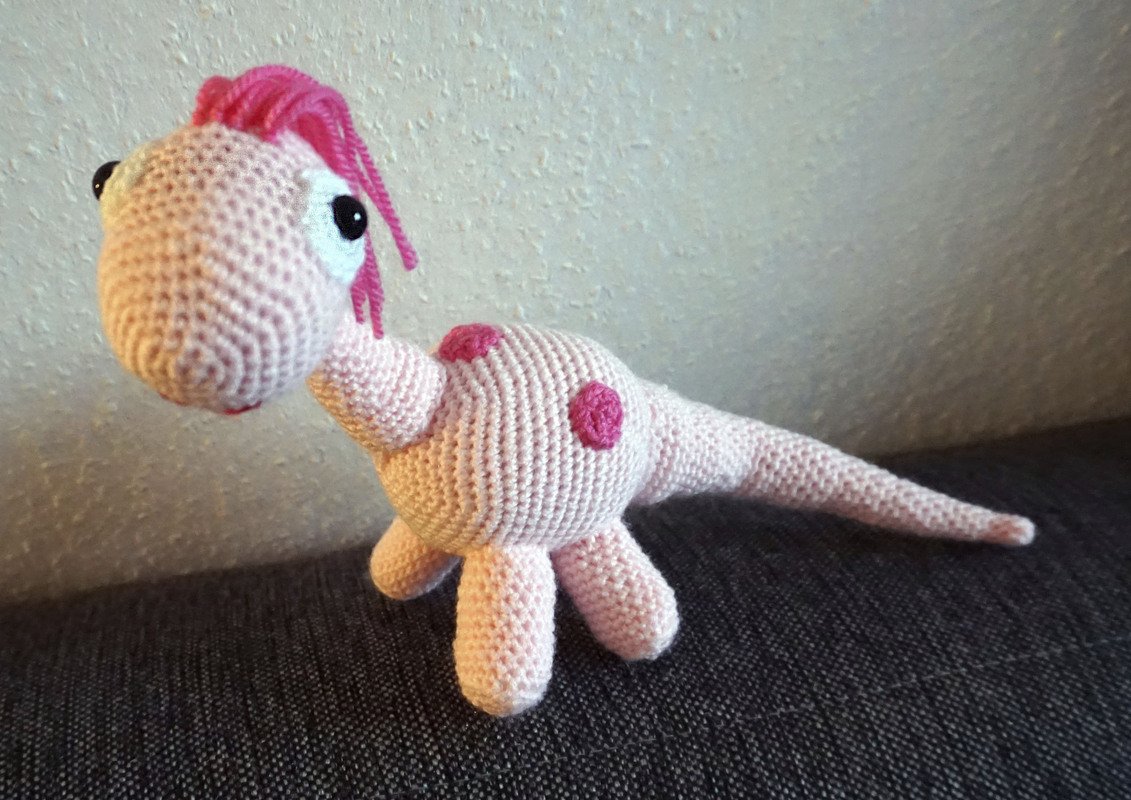 In the crochet instructions, the manufacture of the Dino Rosa is described in Englisch (US) and with numerous pictures on a total of 8 pages. In our instructions there is always a picture for each step, so that you can easily rework.