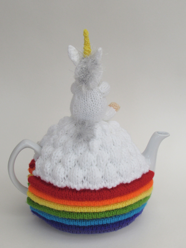 The Unicorn Over the Rainbow tea cosy is fun to knit and looks fabulous.