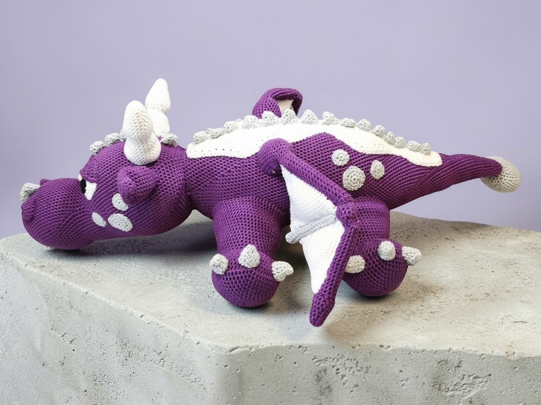 The finished dragon will be about 65cm long and 30cm wide. Of course, the size can vary depending on whether you crochet tight or loose. The choice of wool is also important. I crochet with Apollo cotton yarn 125m/50g (100% cotton).