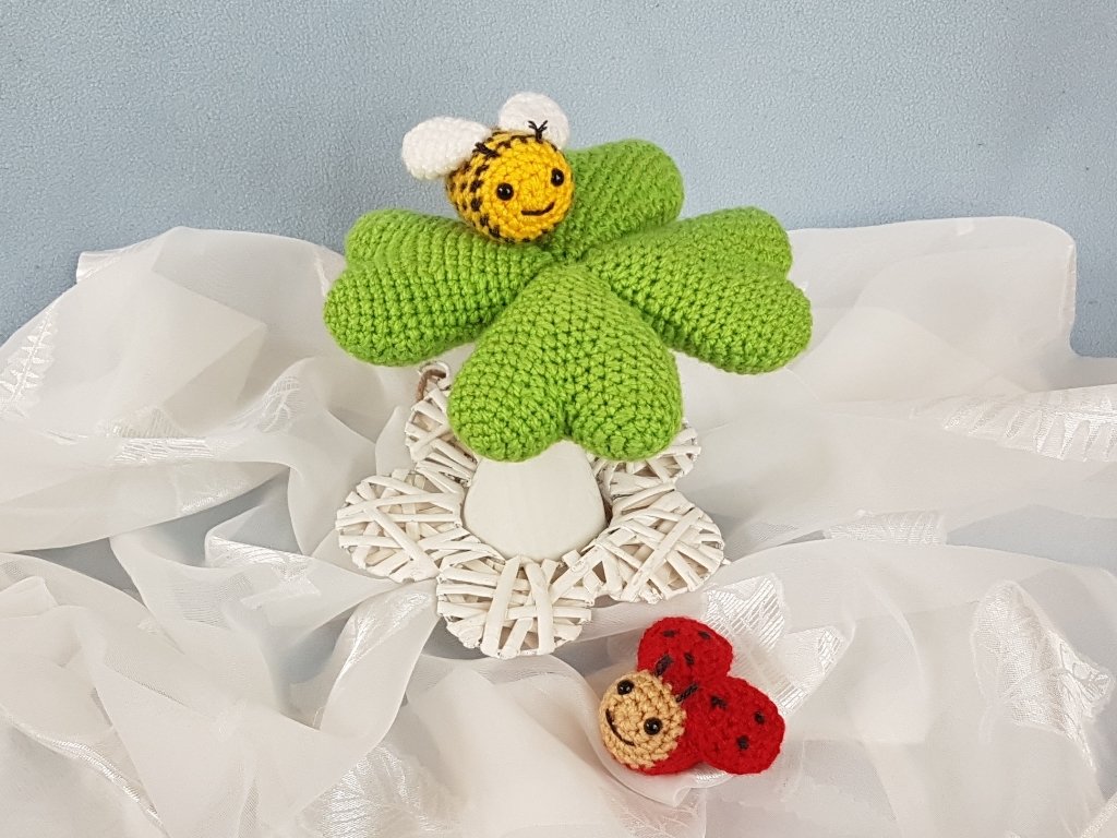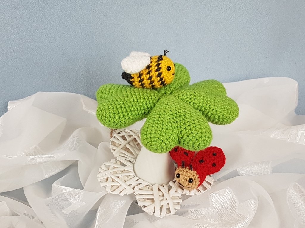 Super schnell gehäkelt und auch für Anfänger mit Grundkenntnissen gut geeignet. Ihr erhaltet eine ausführliche 11-seitige und reich bebilderte Anleitung für ein Kleeblatt mit einer Größe von ca. 17 cm in der Höhe und einem Durchmesser von ca. 18 cm. Dazu gehört natürlich auch noch die Anleitung für das Bienchen und den Marienkäfer.