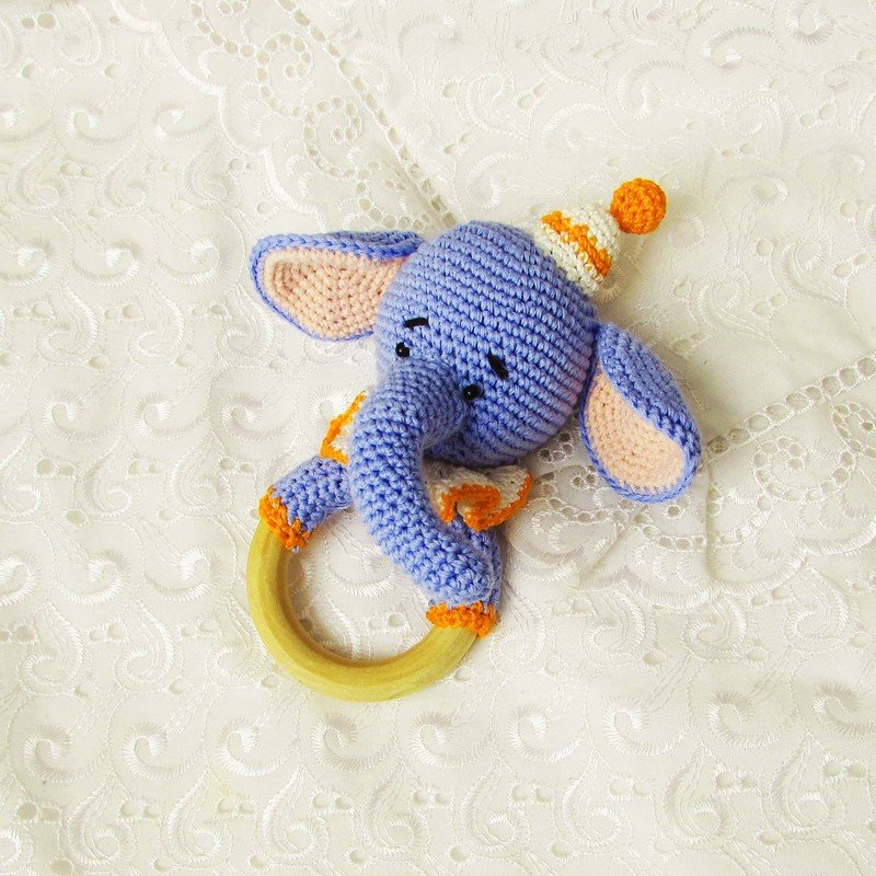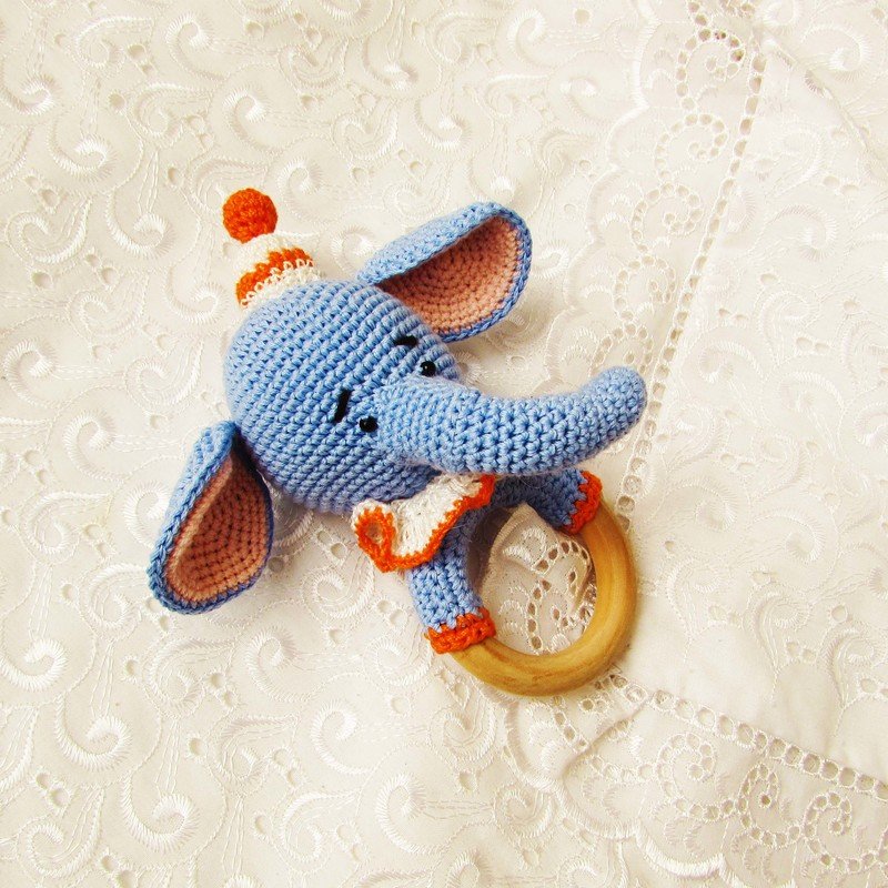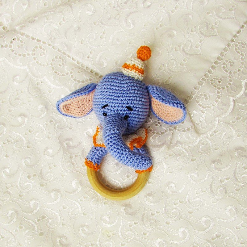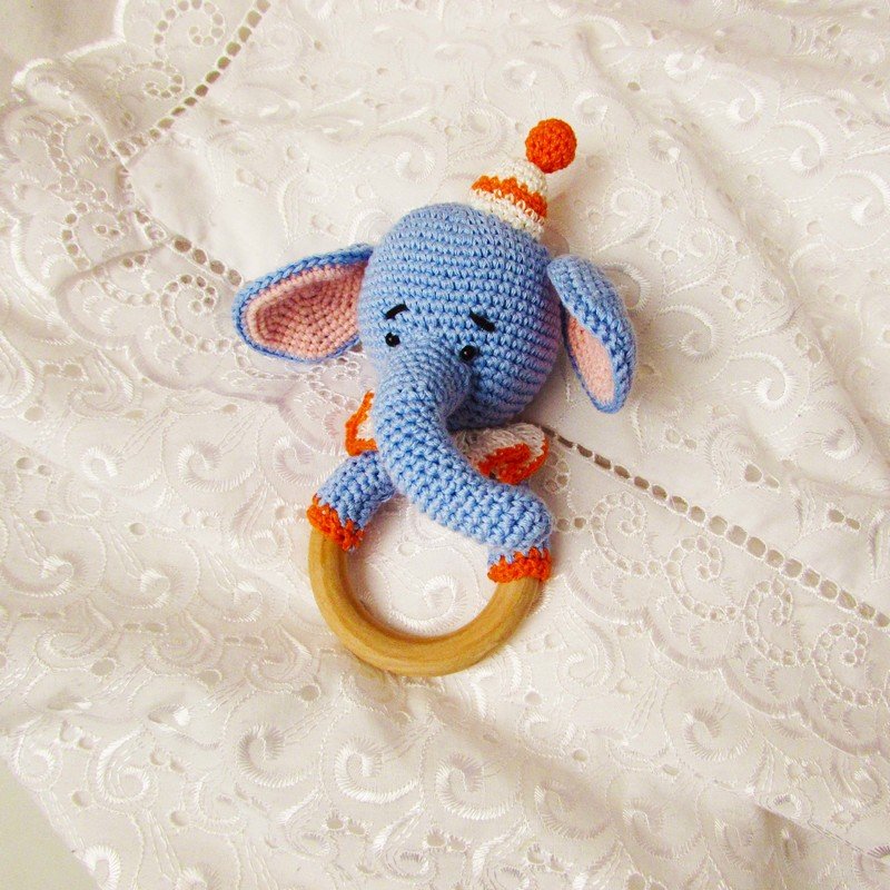Crochet rattle elephant crocheted baby newborn rattle teething ring wooden beads ring, crocheting rattle pattern, baby shower gift.