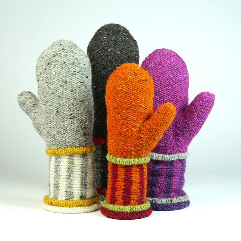 The mittens Dante match perfectly the hat of the same name. I used the piping technique, striped bands and reverse stockinette stitch (which is knitted, not purled, you work inside out :-)) that invite you to mix colours to your hearts content! Again, I used the fantastic tweed wool from Ireland, but you can use any yarn with the same gauge.