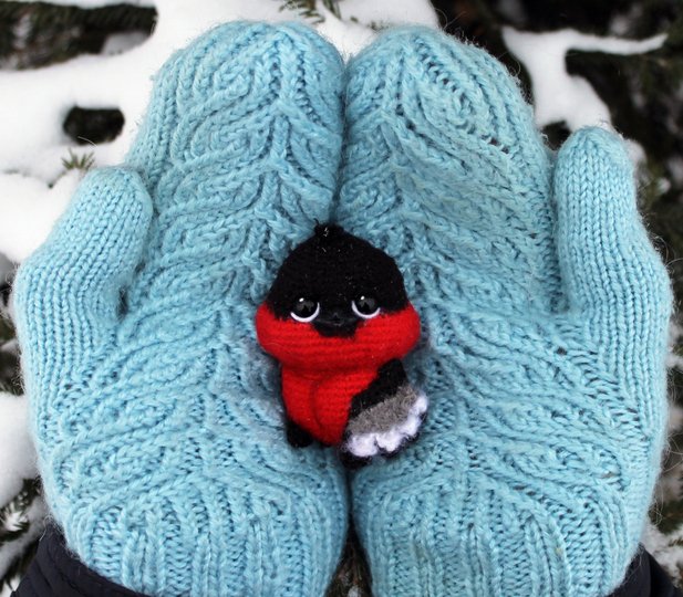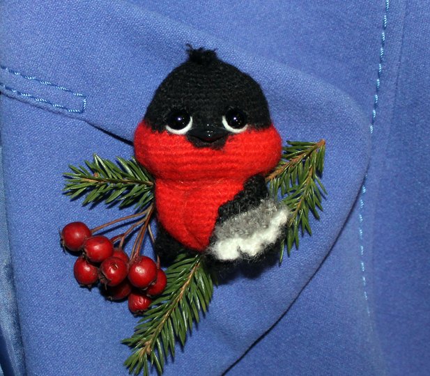 Following my tutorial what you will get is a cute 3D bullfinch brooch. It has a fastener on the back and will look gorgeous on winter clothing, be it a coat collar, jumper, scarf, or a hat and a cap. It may also add a nice little touch to the clothes of your child. Provided you use fine yarn like mohair, angora, wool 450 m/100 g, the brooch will be approximately 7 cm long. Should you decide to use thicker yarn, the finished size of the brooch will be bigger. You may also turn it into a keyring or a pendant for your handbag.