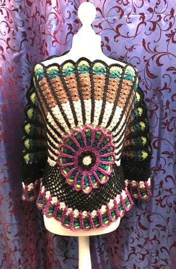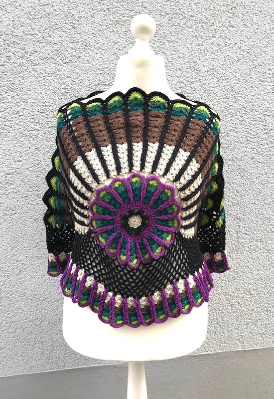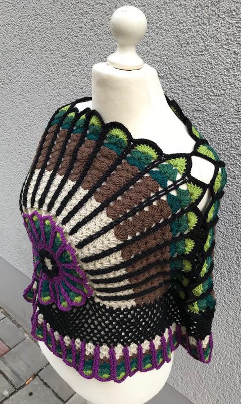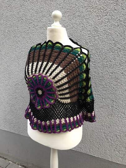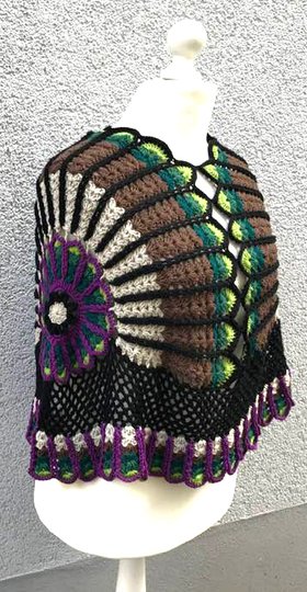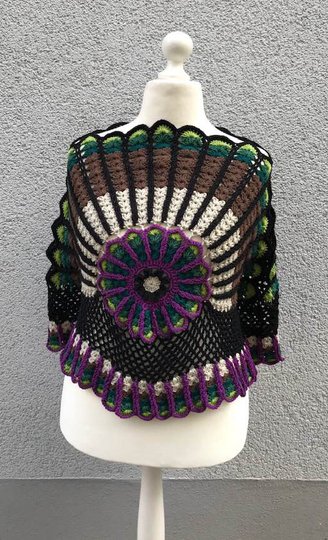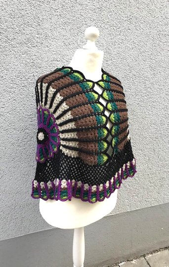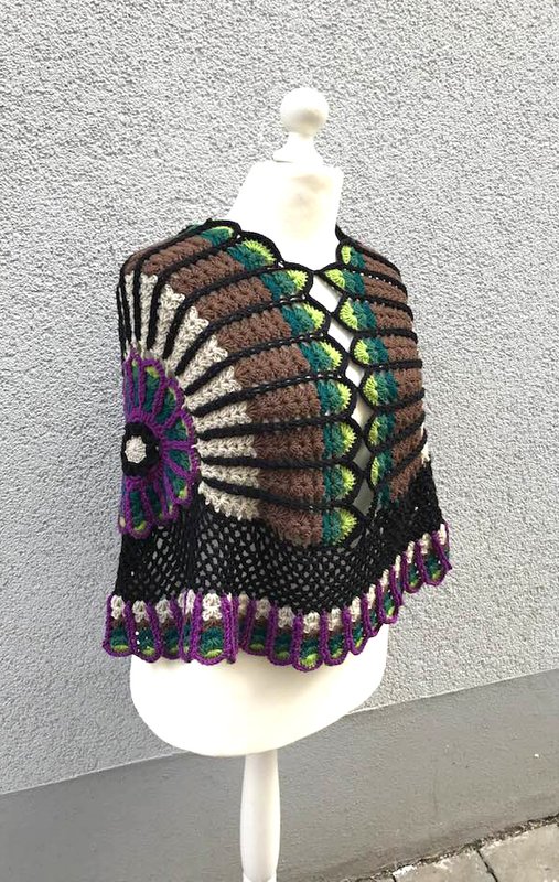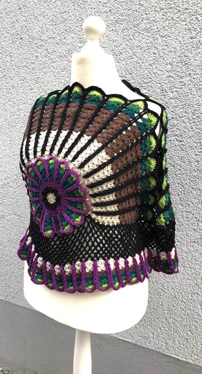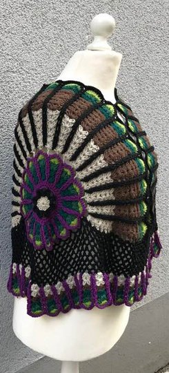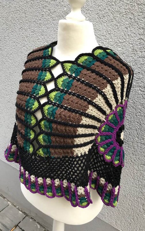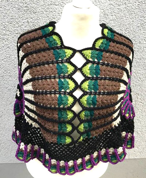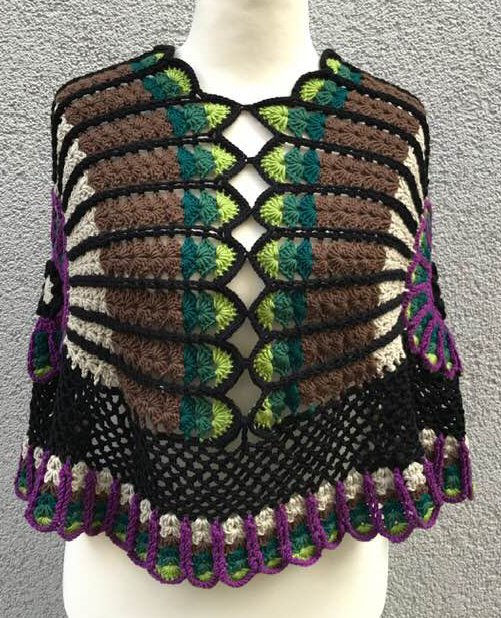 Poncho "Tijuana" ( wiegt fertig 440 gr) kann man für jede Größe auch mit mehr Reihen machen..dann brauchst Du aber auch mehr Wolle ..dieser hier ist auf einer Schneiderpuppe mit Größe 46 fotografiert