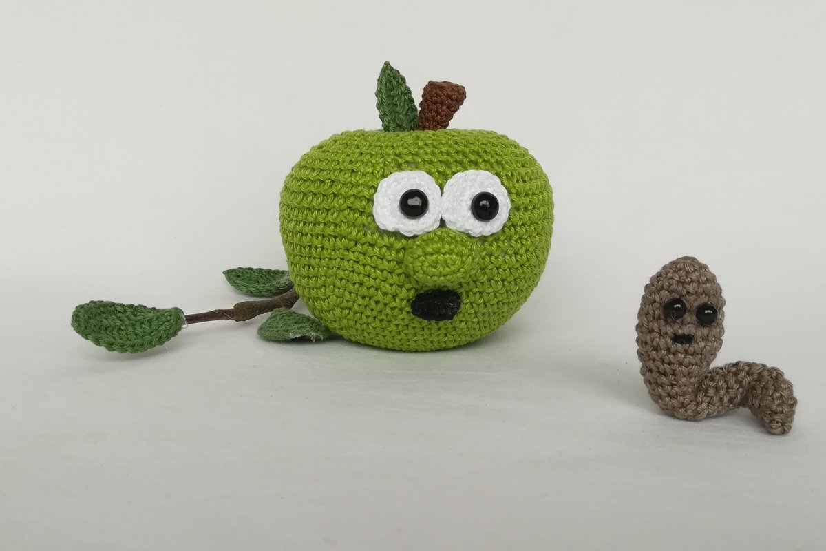 This pdf contains the crochet pattern for the apples with faces and two worms in different sizes.
