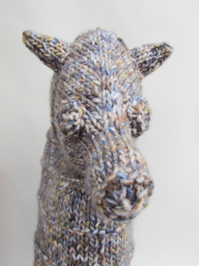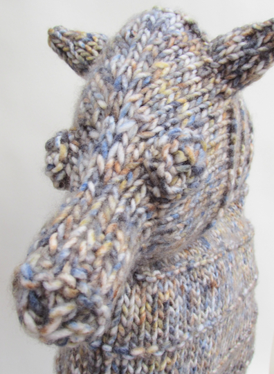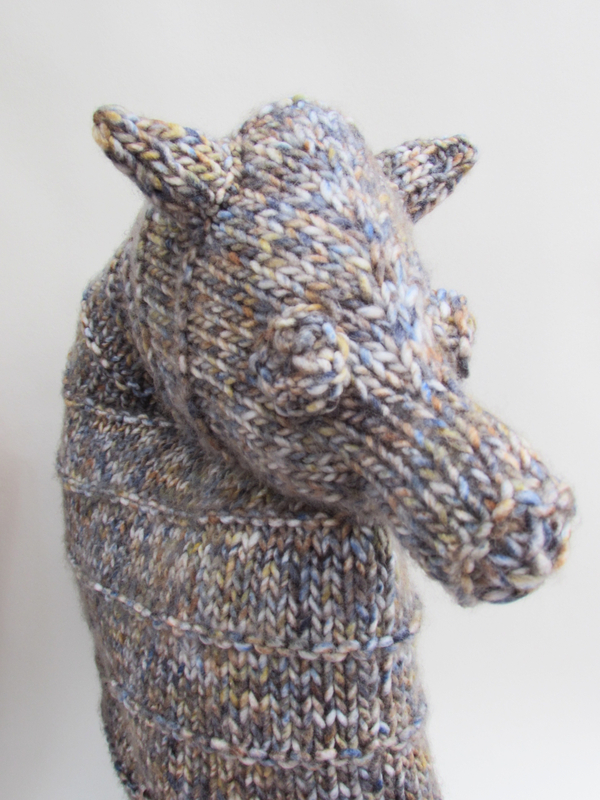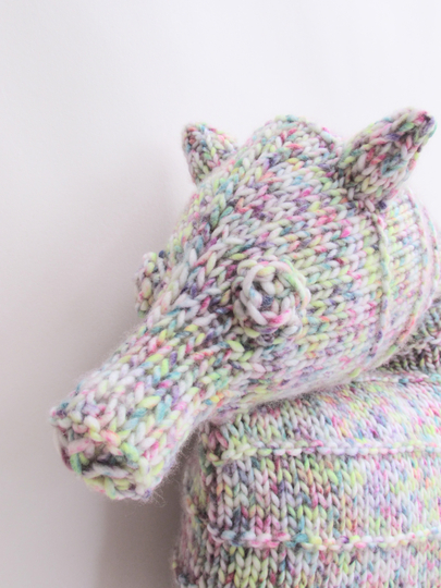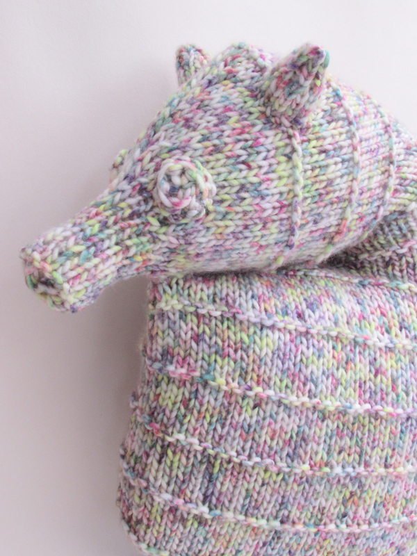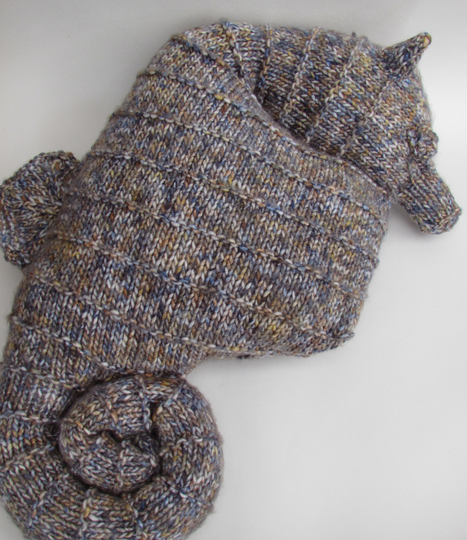 Most of the seahorse cushion is knitted in one piece and then the additional bits are knitted and added separately. The pattern is a simple stocking stitch with a single inverted row which was inspired by the ridges and spikiness of seahorses.