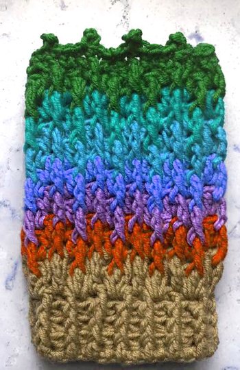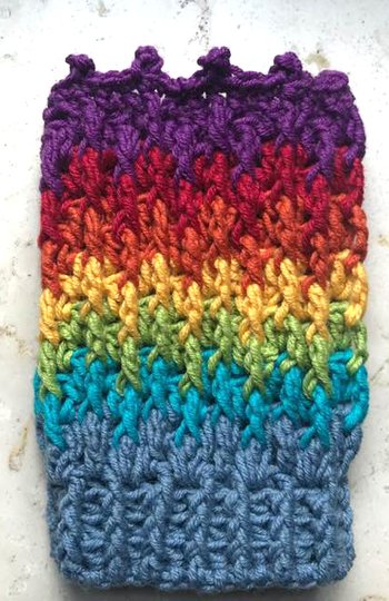 Die Stulpe Regenbogen besteht aus Stäbchen, Reliefstäben und doppelten Reliefstäben