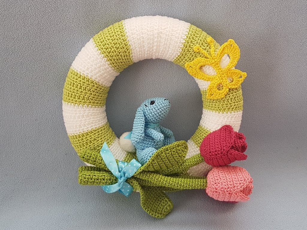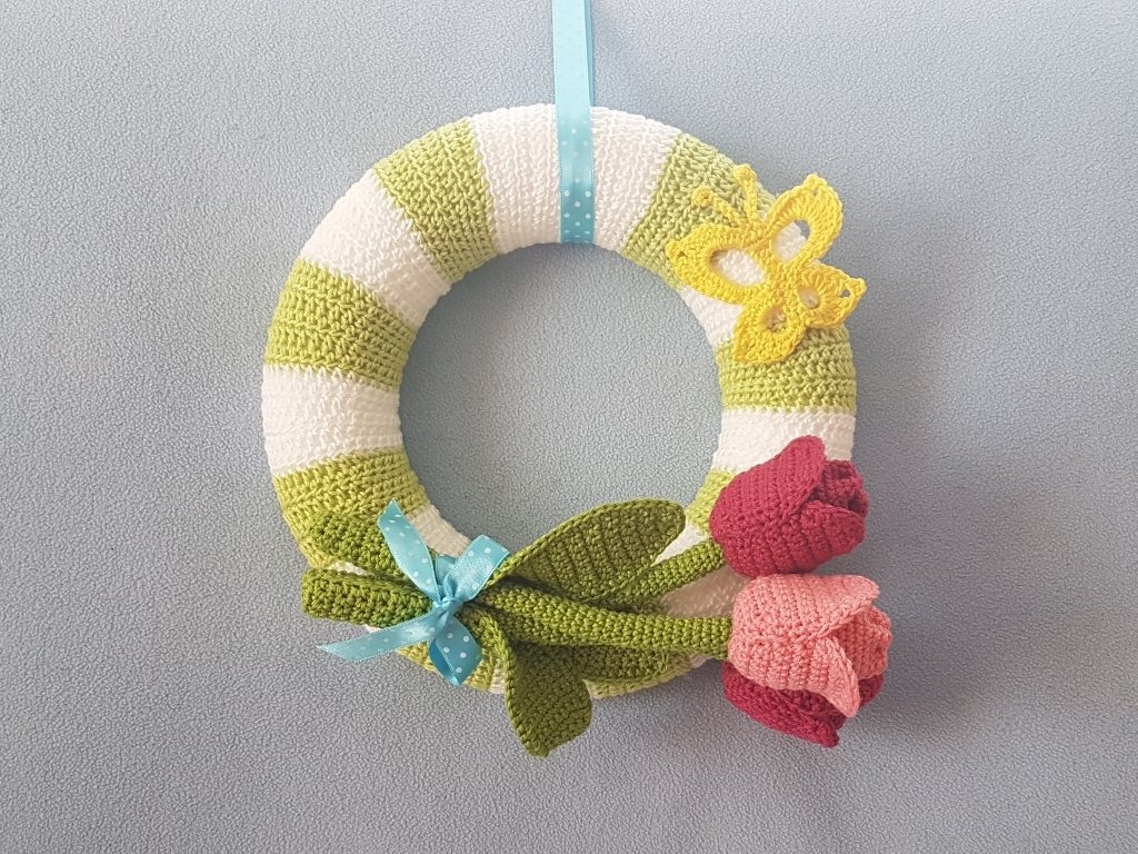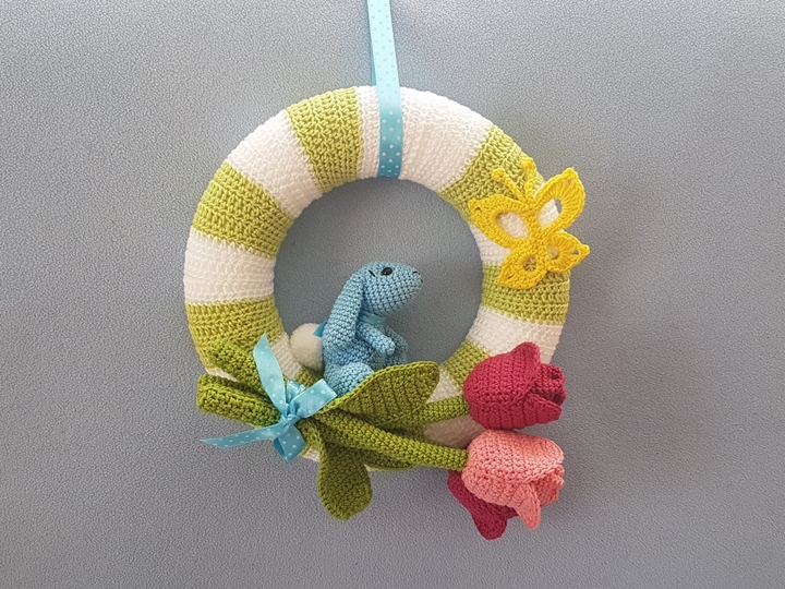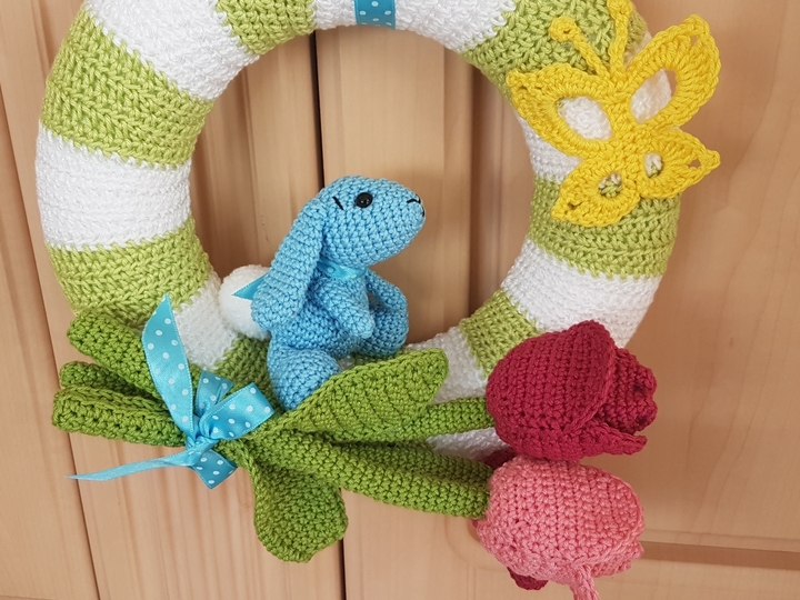 Ihr erhaltet eine ausführliche 20-seitige und reich bebilderte Anleitung für einen Deko-Kranz im Frühlings-Outfit, mit Tulpen, einem Häschen und einem Schmetterling.