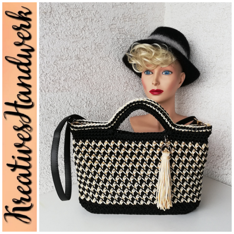 In der Anleitung wird alles beschrieben, der gehäkelte Boden, ein Muster welches man verwenden könnte, der Gurt und auch der Griff.