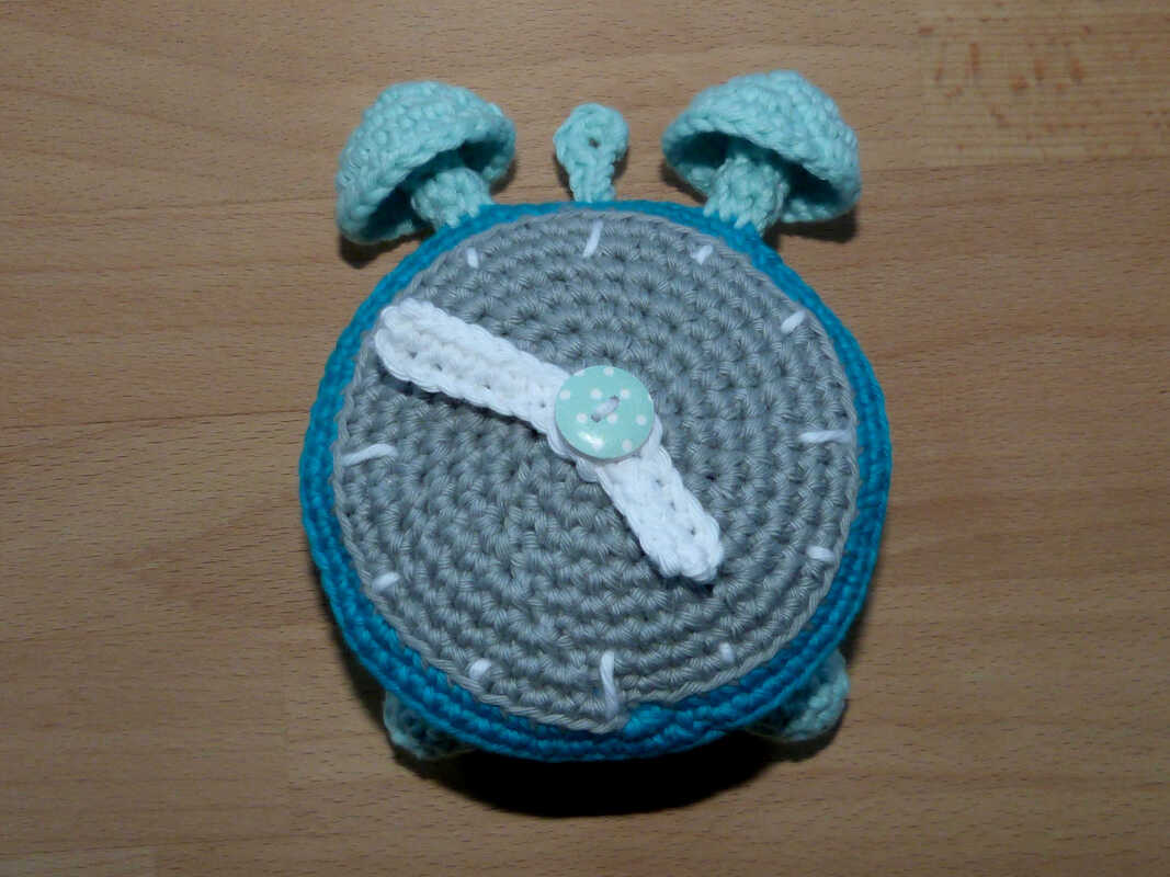 If you use cotton yarn with a yardage of 200y/3.5oz (90m/50g) and a hook size 3.5, the alarm clock will get about 12 cm high and 10 cm wide. The toy will be suitable for children from the age of 3 up.