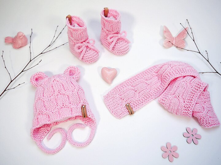 Your baby will always be perfectly dressed with this lovely set of booties, a bonnet and a scarf. Its design with the cute bear ears on the bonnet and the pattern itself not only beautiful, but useful as well. The earflaps and the ribbon keep the bonnet in the right position to keep your sweetheart cozy and warm.
