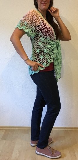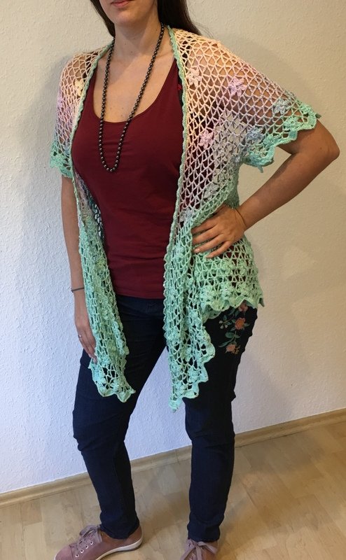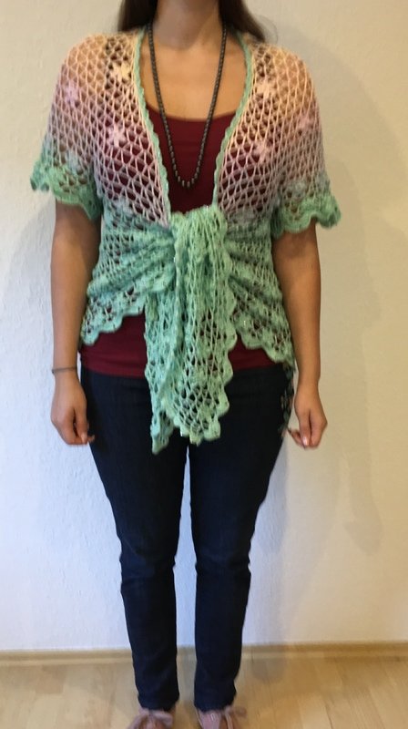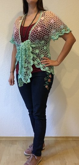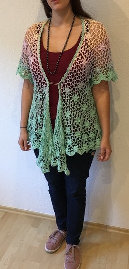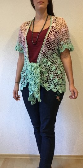 Eine lässig geschnittene Kurzarmjacke. Ein Begleiter für das ganze Jahr. Getragen über Jeans oder elegant über ein Kleid, geknotet oder offen getragen immer ein Blickfang.