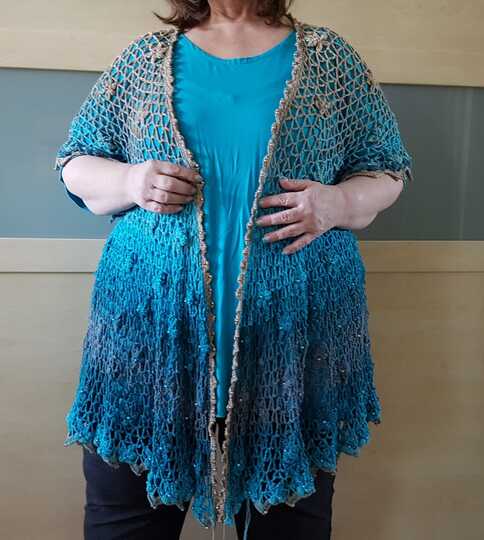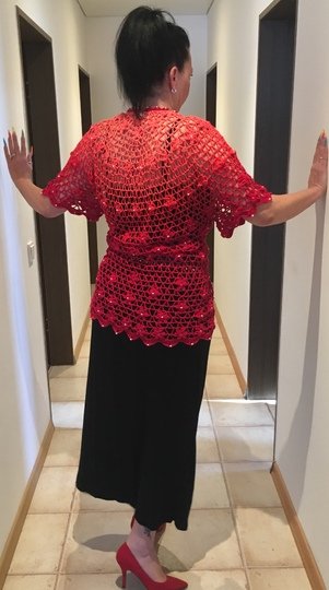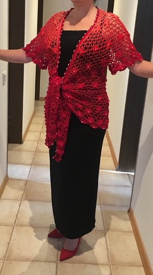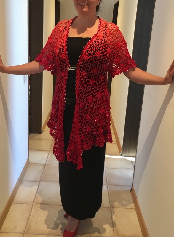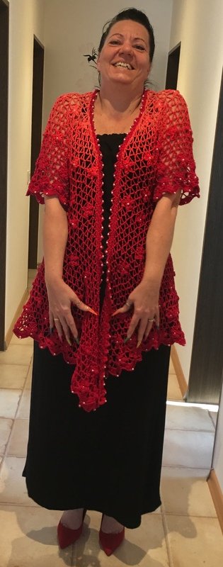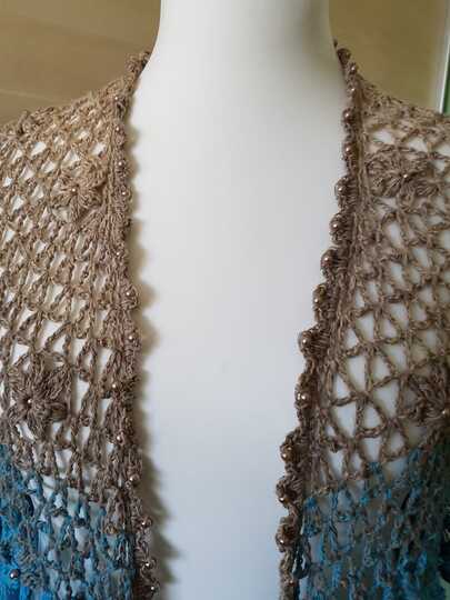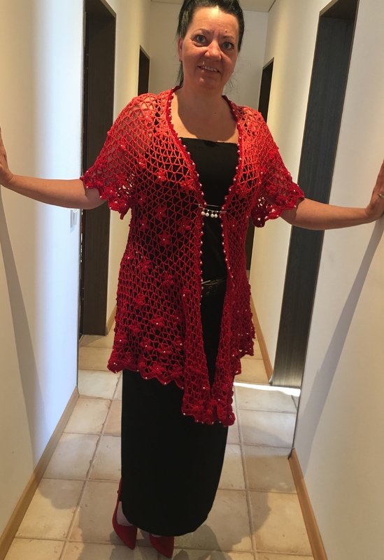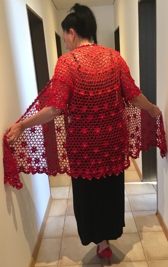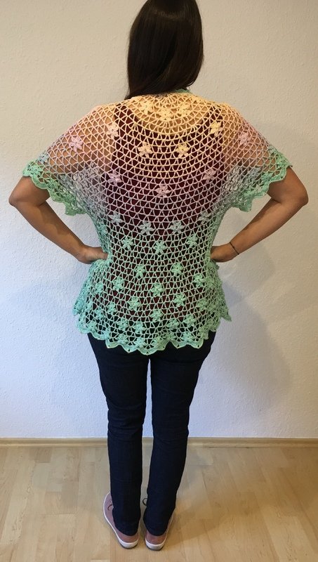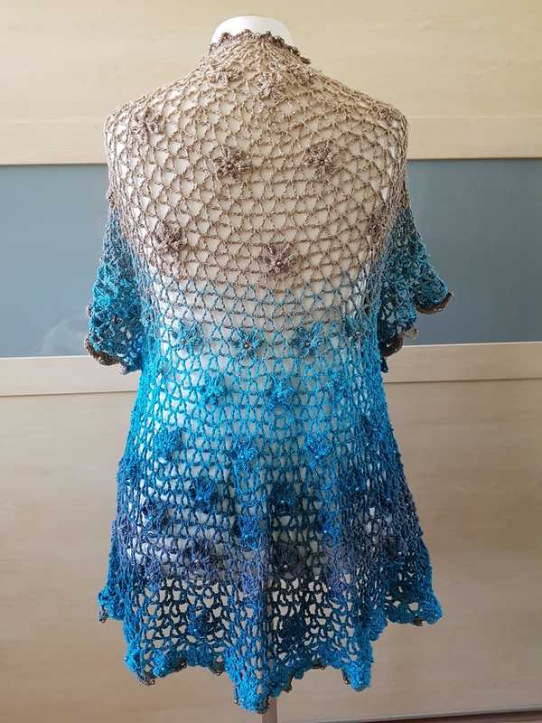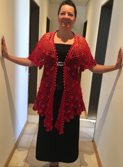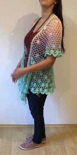 Es kann mit langem, kurzem oder ohne Zipfel gehäkelt werden. Auch die Länge gestaltest du dir nach deinen Vorstellungen. Das regenbogenfarbene Modell hat einen kurzen Zipfel, das rote Modell einen langen und das blaue gar keinen. Ich gebe dir hierzu verschiedene Möglichkeiten. Die Jacke wird in einem Stück von oben nach unten gehäkelt. Die Perlen werden gleich mit eingehäkelt.