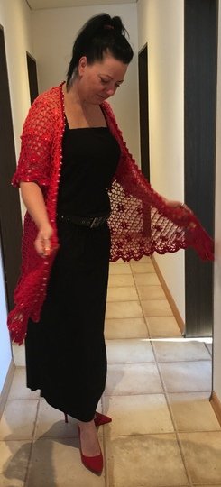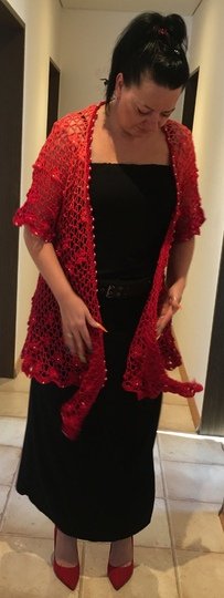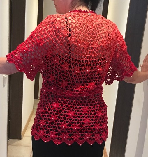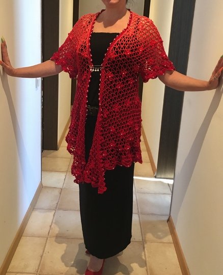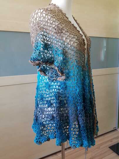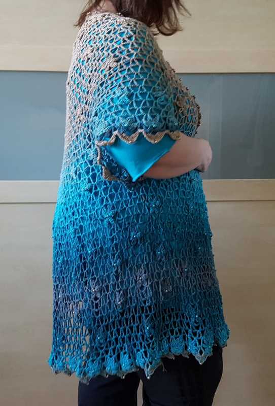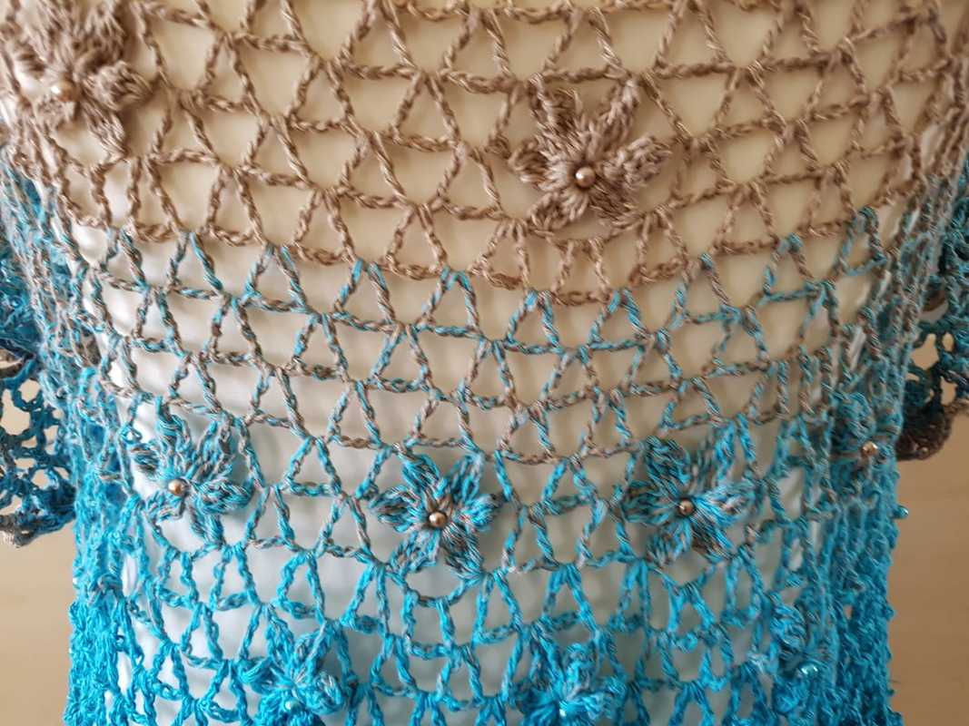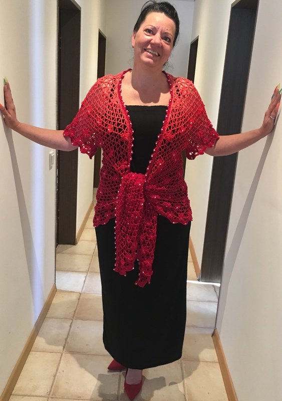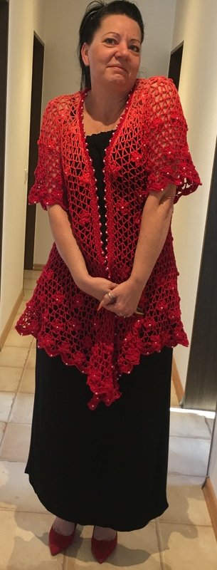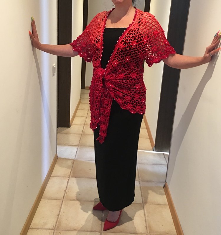 Es kann mit langem, kurzem oder ohne Zipfel gehäkelt werden. Auch die Länge gestaltest du dir nach deinen Vorstellungen. Das regenbogenfarbene Modell hat einen kurzen Zipfel, das rote Modell einen langen und das blaue gar keinen. Ich gebe dir hierzu verschiedene Möglichkeiten. Die Jacke wird in einem Stück von oben nach unten gehäkelt. Die Perlen werden gleich mit eingehäkelt.