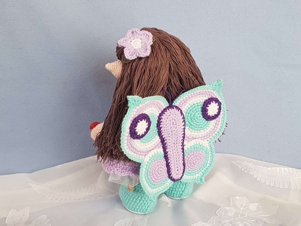 Die Größe der Puppe liegt ca. bei 30 cm. (bei Verwendung der angegebenen Nadelgröße und Garnstärke)