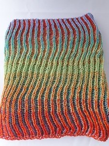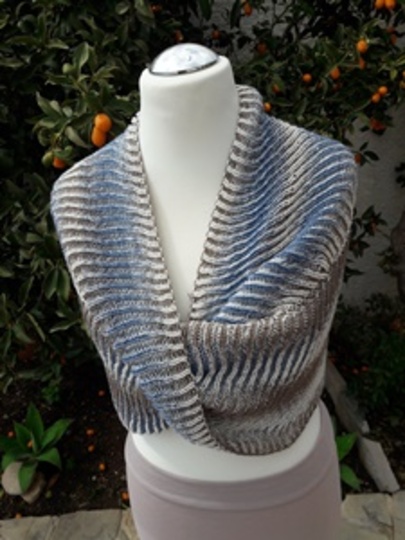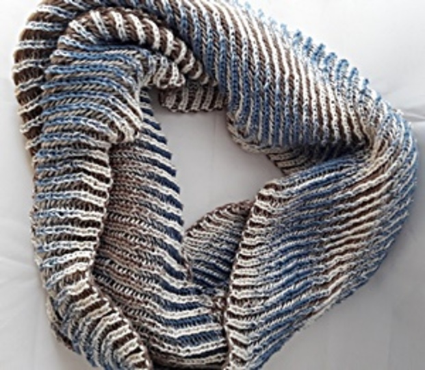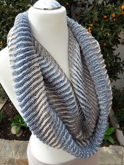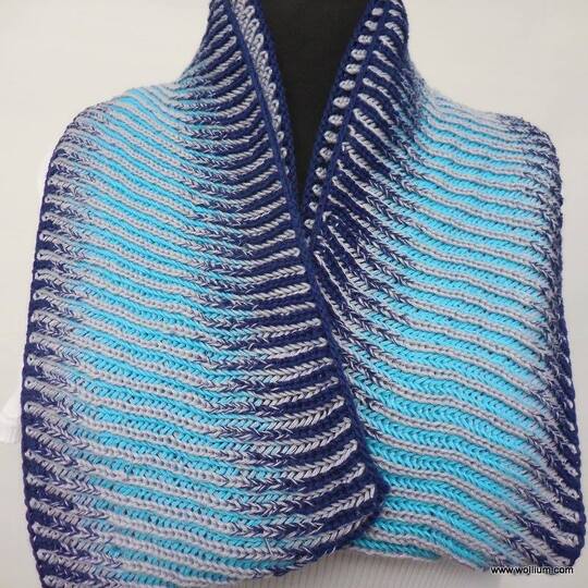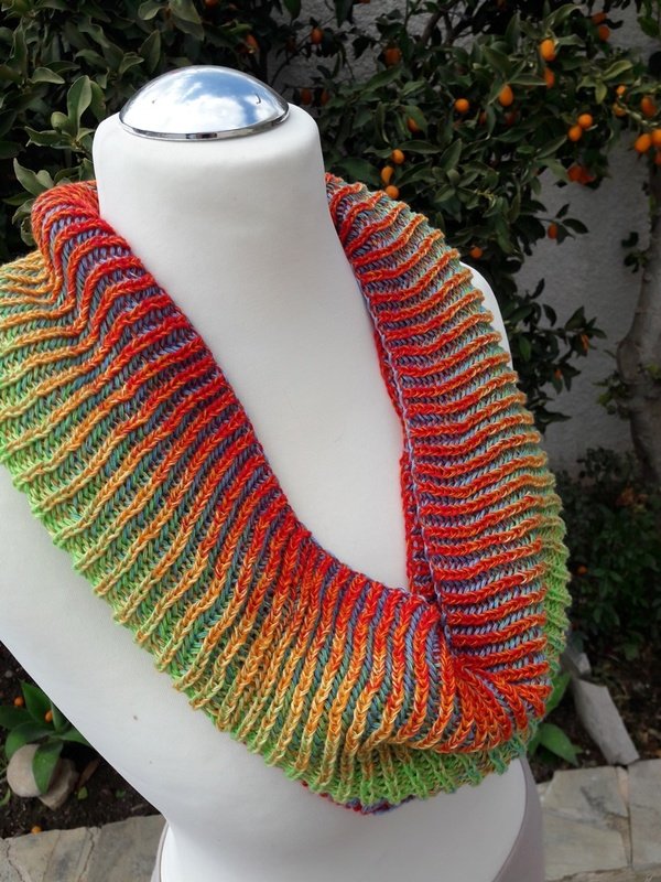 „MöBrio“ is a Möbius (a loop or round scarf which has been turned in itself once) that is knitted with a lighthouse coil using the Brioche pattern (full patent).