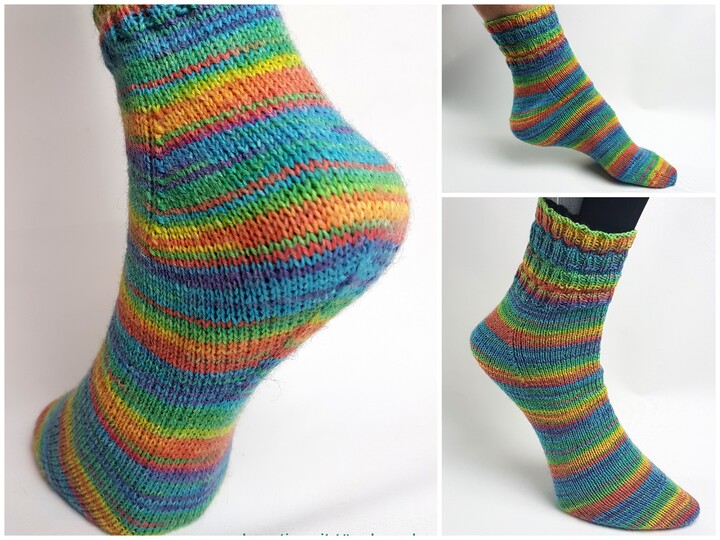 Mein verwendetes Garn für die Fixe-Ferse „Ringelpitz“ ist von Opal-Sockenwolle, LL 420m auf 100g. Meine Socke hat Gr. 36/37 und eine Schaftlänge von 7 cm. Verbrauch ca. 60g/Paar.