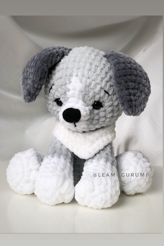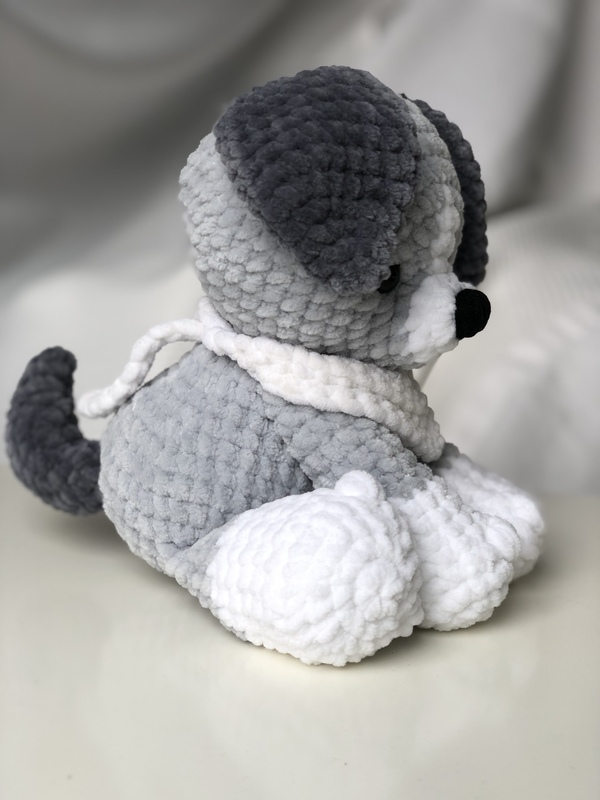 -> mit einem Flauschgarn und einem Hilffaden und Häkelnadel Nr. 6.0 wird der Welpe ca. 24 cm groß.