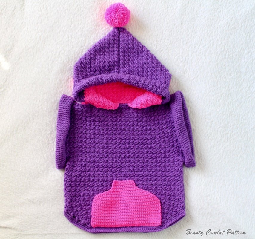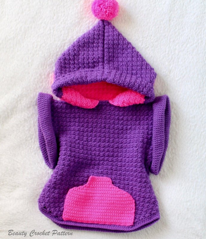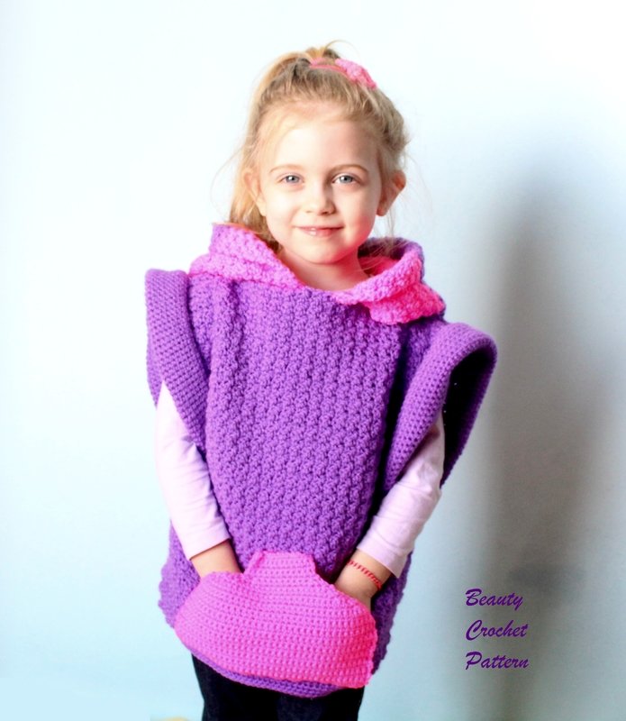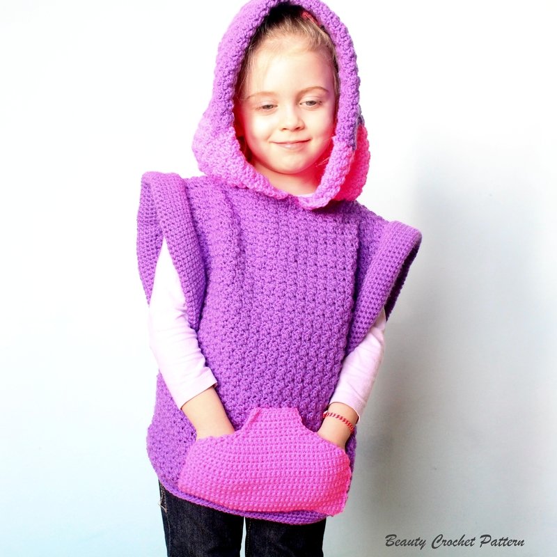 Hoodie is sleeveless, free-style and can be wear as poncho or vest over jeans jacket, tshirt. It is absolutely must have for spring walks. The fun here is in contrasting colors, pompom and central pocket. Using the basic stitches that each beginner has, we get a beautiful texture for both girls and boys.