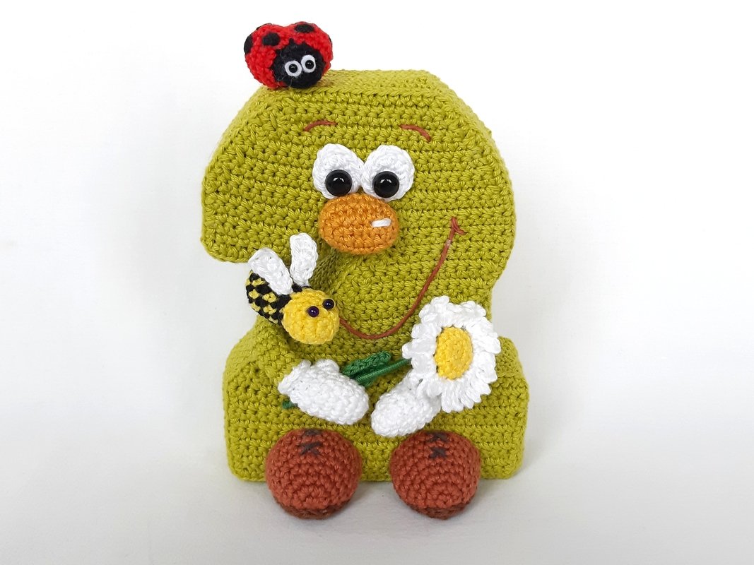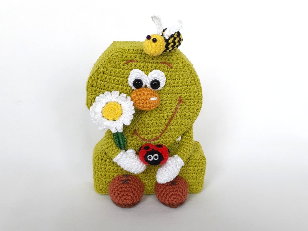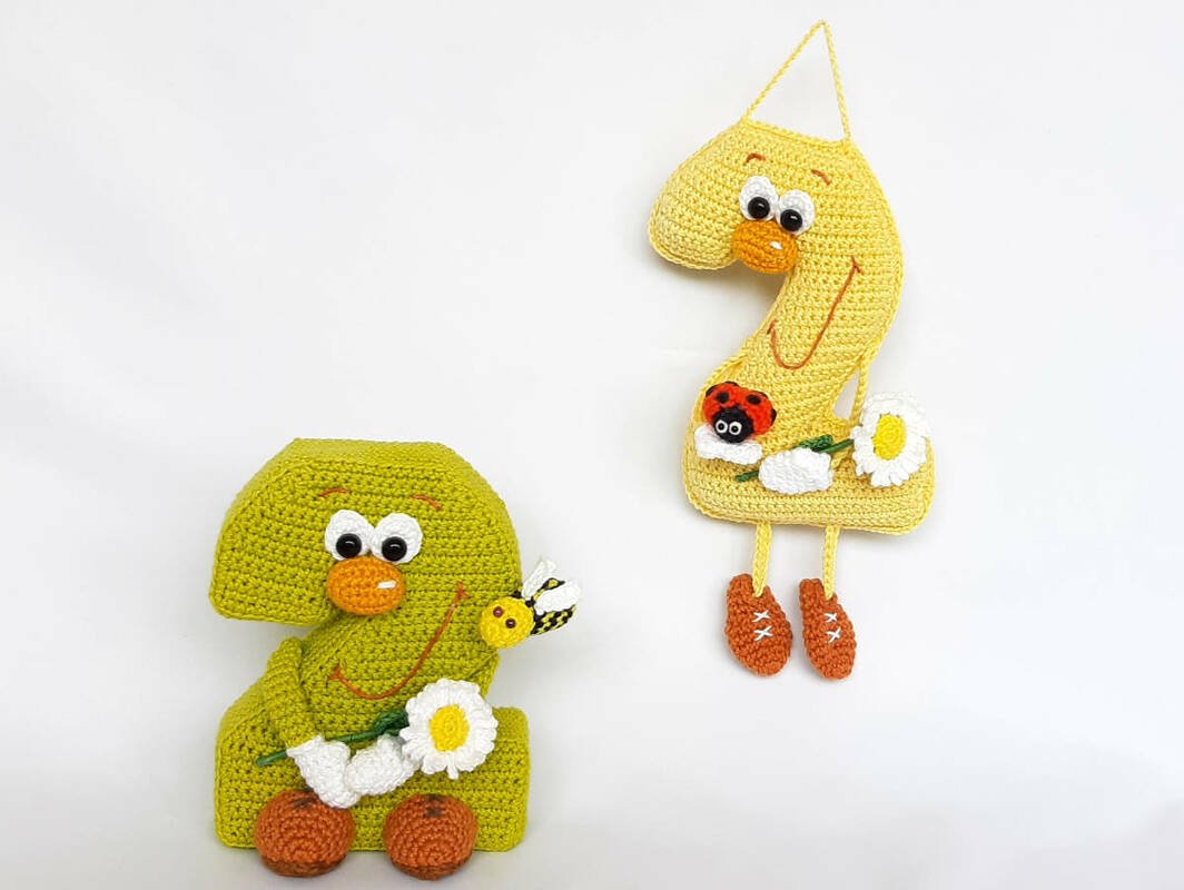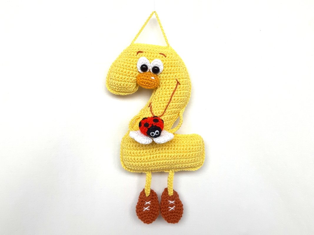 You receive a pattern for the Number 2 in standing and hanging variant including the pattern for the daisy, the bee and the ladybug.