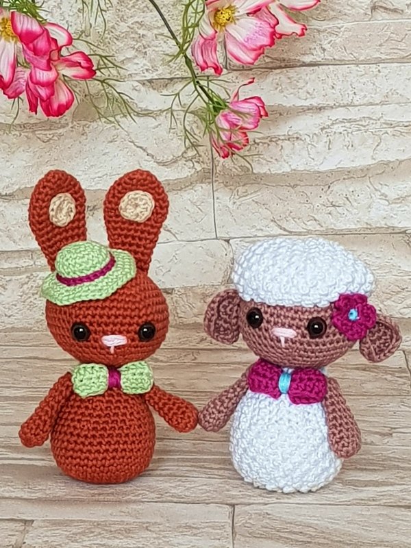 using the indicated yarn and crochet hook, the bunny will be ca. 14 cm tall, and the chicklet and lamb will be ca. 10-11 cm tall